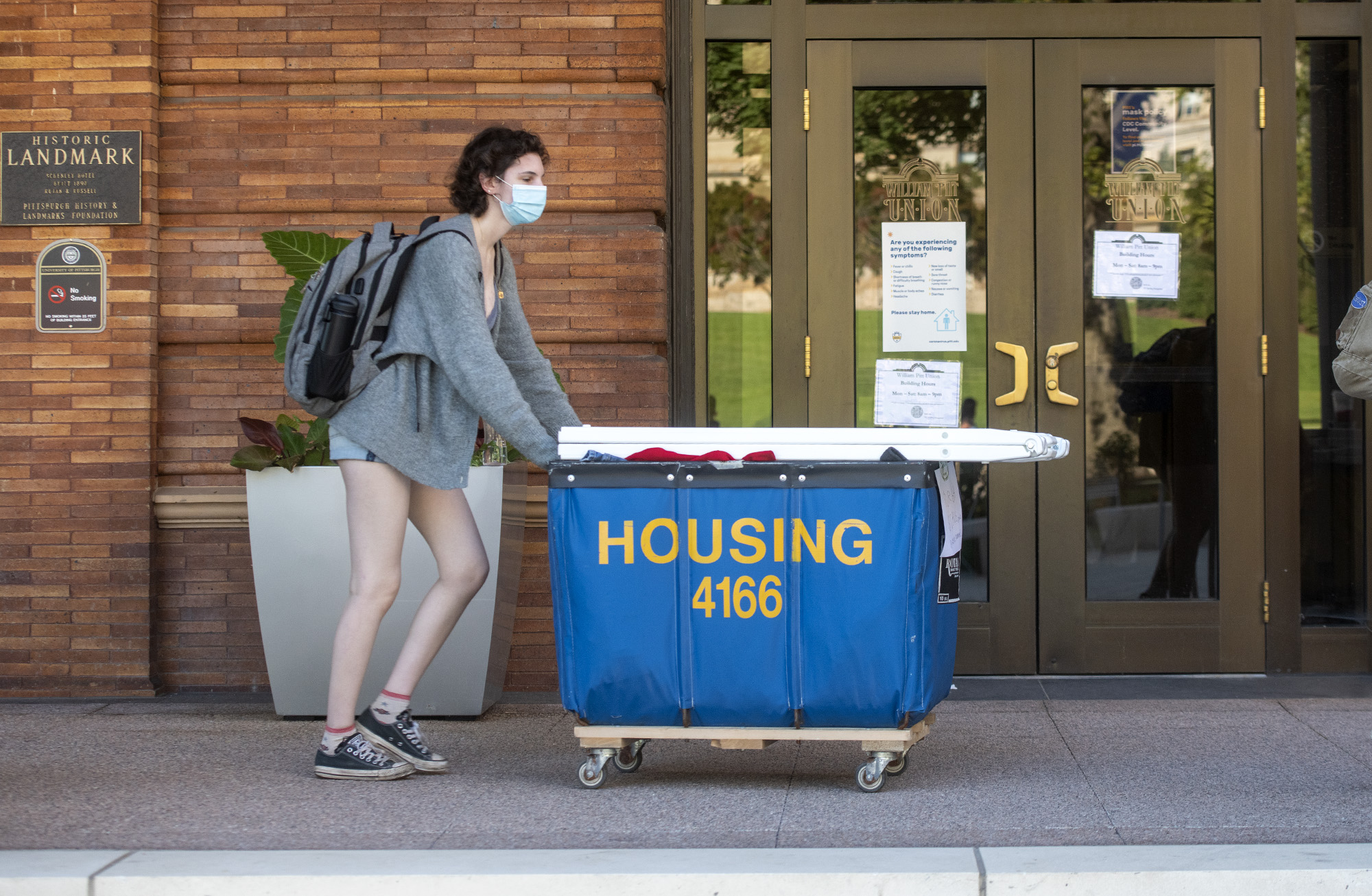 Jennah Reibsone, a sophomore at the University of Pittsburgh leaves the student union with supplies for Thriftitque, the campus thrift store with her mask on Friday, Aug. 19, 2022 in Pittsburgh. University of Pittsburgh is requiring masks indoors in accordance with CDC guidelines. (Pam Panchak/Post-Gazette)