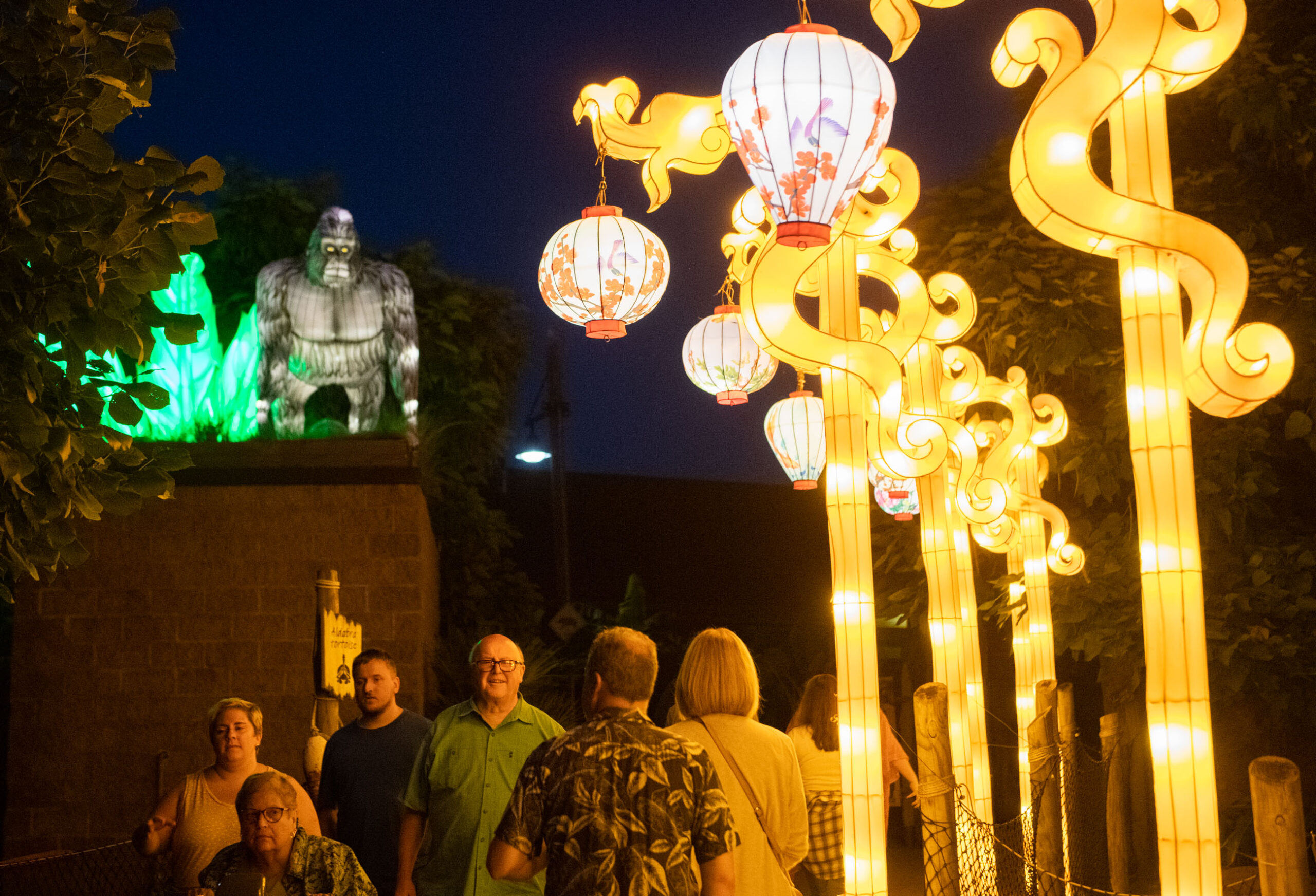 People walk through the Asian Lantern Festival on Friday, Aug. 19, 2022, at the Pittsburgh Zoo and PPG Aquarium in Highland Park. The Asian Lantern Festival will continue on select nights through October. (Emily Matthews/Post-Gazette)