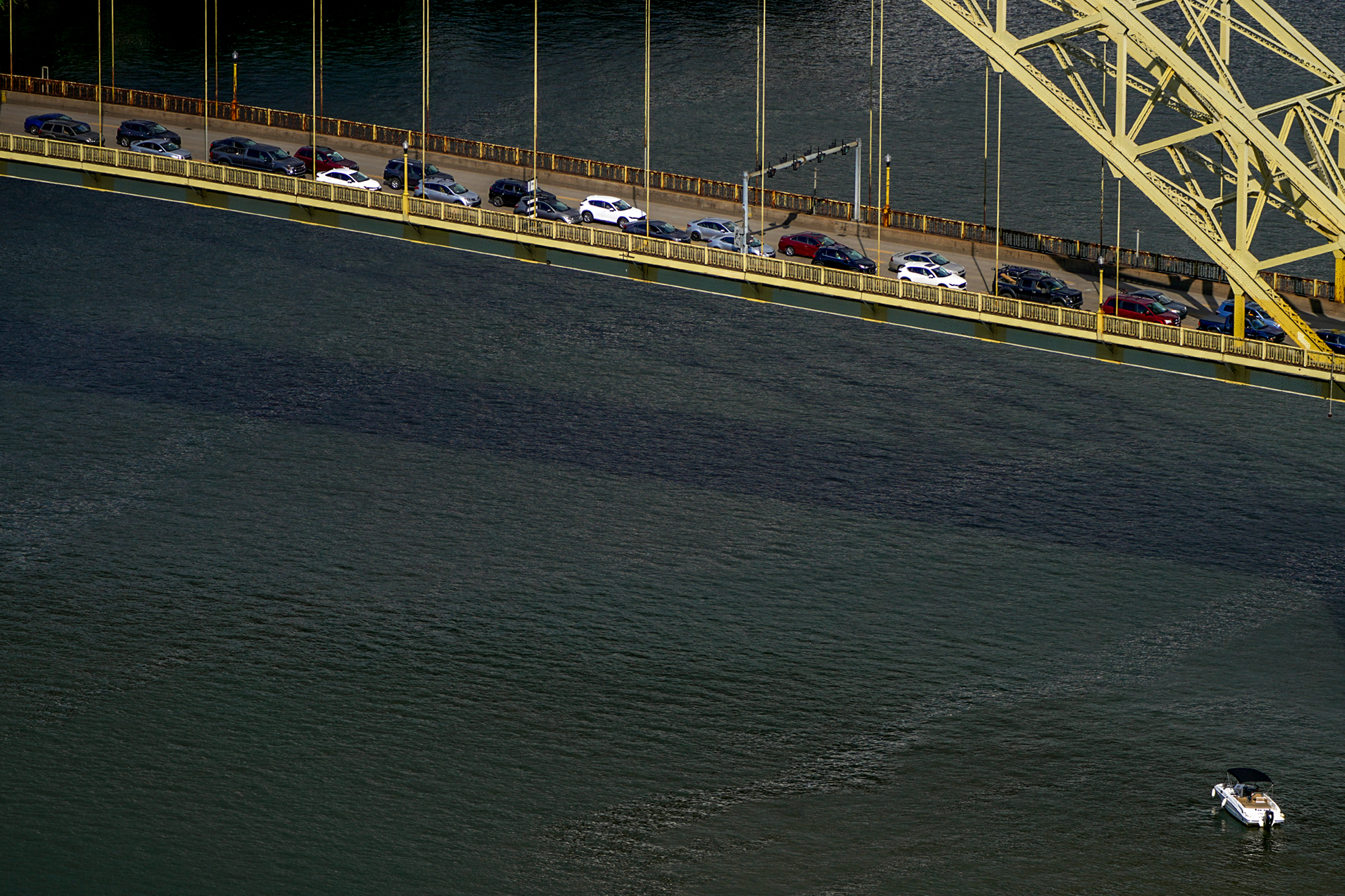 feature August 17, 2022 • 2400 × 1600 • Week in photos: Aug.14-20, 2022 As cars sit in traffic on the West End Bridge, a boater floats below them on the Ohio River, photographed from West End Overlook Park in Elliott, Wednesday, August 17, 2022. (Alexandra Wimley/Post-Gazette) #standalone