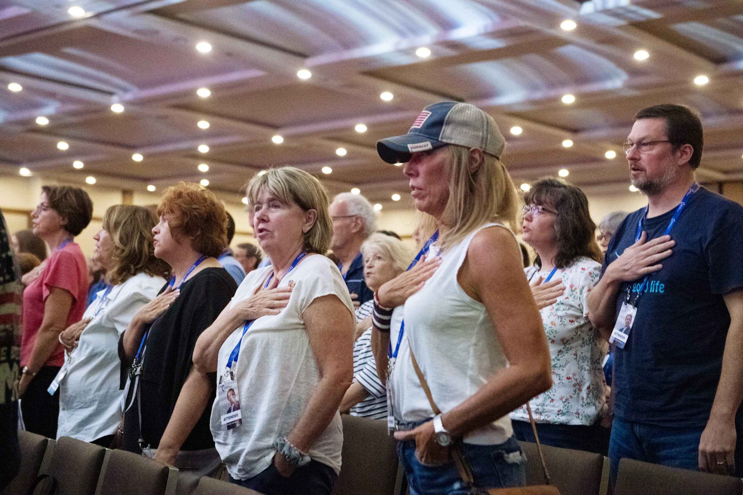 Supporters recite the Pledge of Allegiance before Republican nominee for Pennsylvania Governor Doug Mastriano and Florida Governor Ron DeSantis speak during Turning Point Action’s “Unite and Win” Rally on Friday, Aug. 19, 2022, at Wyndham Grand in Downtown. (Emily Matthews/Post-Gazette)