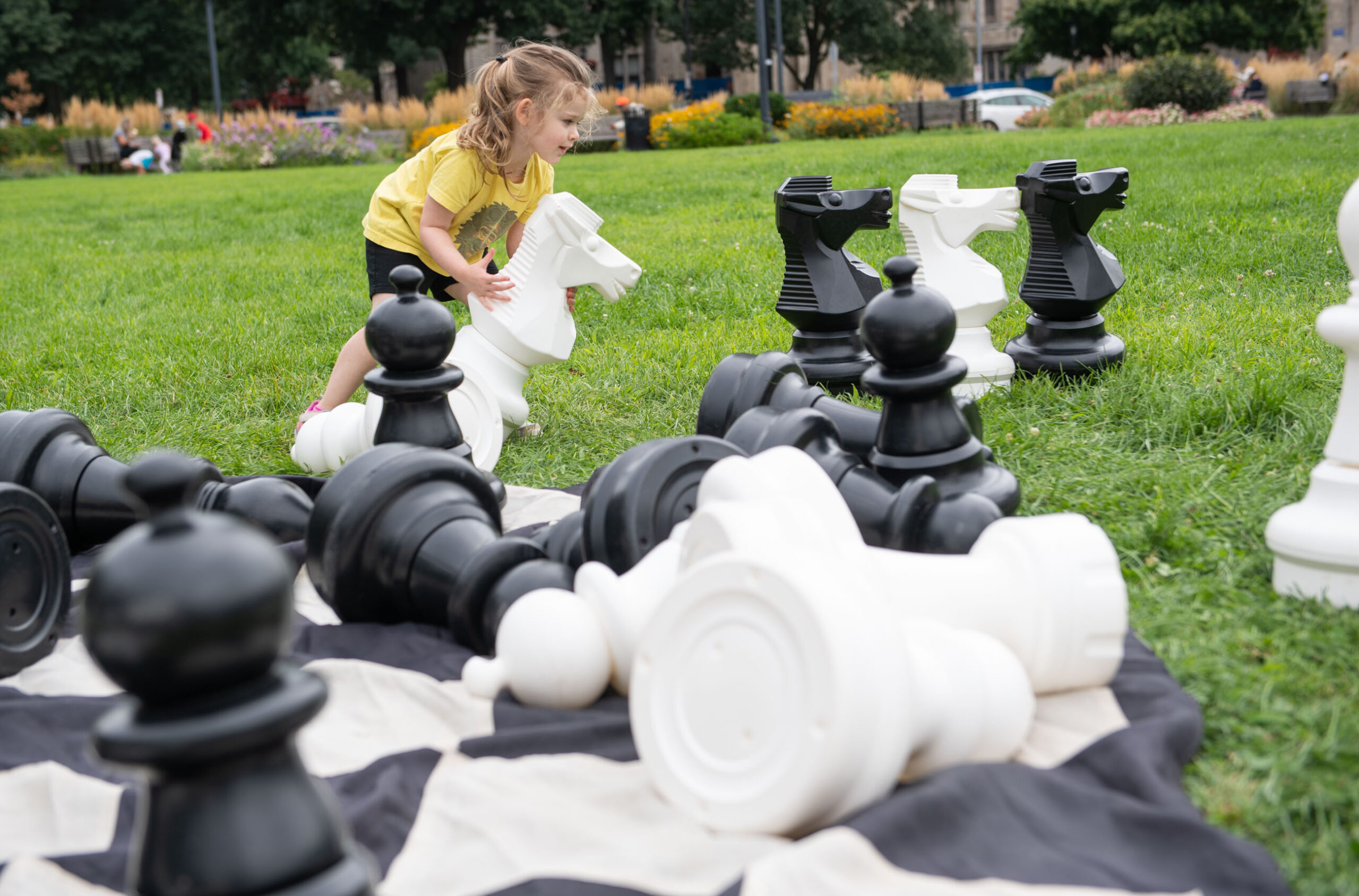 Josie Carnes-Broman, 3, of Verona, rearranges chess pieces on Sunday, Aug. 14, 2022, during Kids’ Day in Schenley Plaza in Oakland. The event included free carousel rides, face painting, a balloon artist, and craft activities. (Emily Matthews/Post-Gazette)