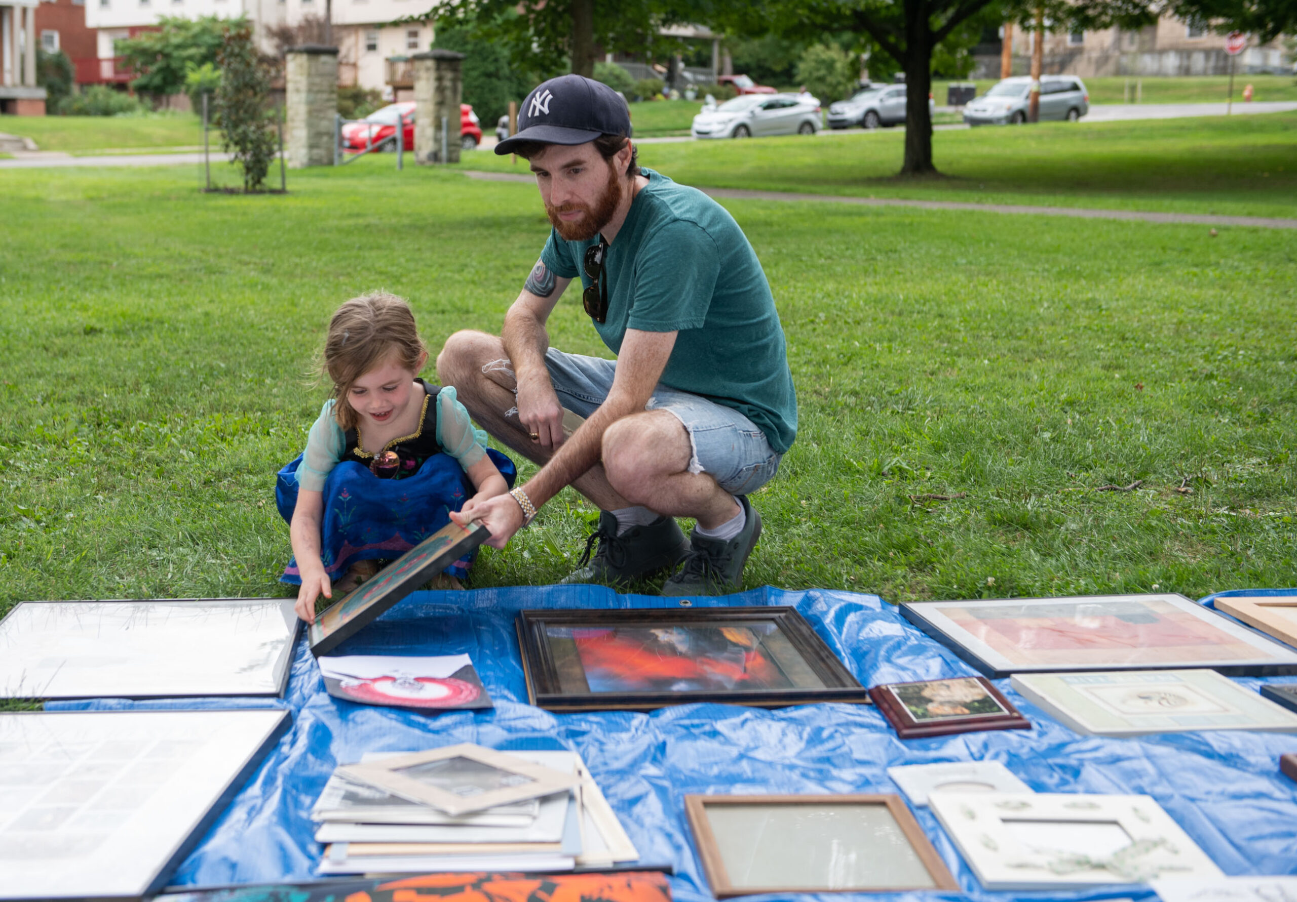 Fiona Brennan, 4, picks out a piece of art with her father Mike Brennan, both of Stanton Heights, at Reuse Reunion, an art swap hosted by Pittsburgh Center for Creative Reuse, on Sunday, Aug. 14, 2022, at Westinghouse Park in Point Breeze. The art swap included hands-on activities and free materials that could be used to make art. Attendees could bring a piece of art to swap, but they could also take a piece without bringing anything. (Emily Matthews/Post-Gazette)