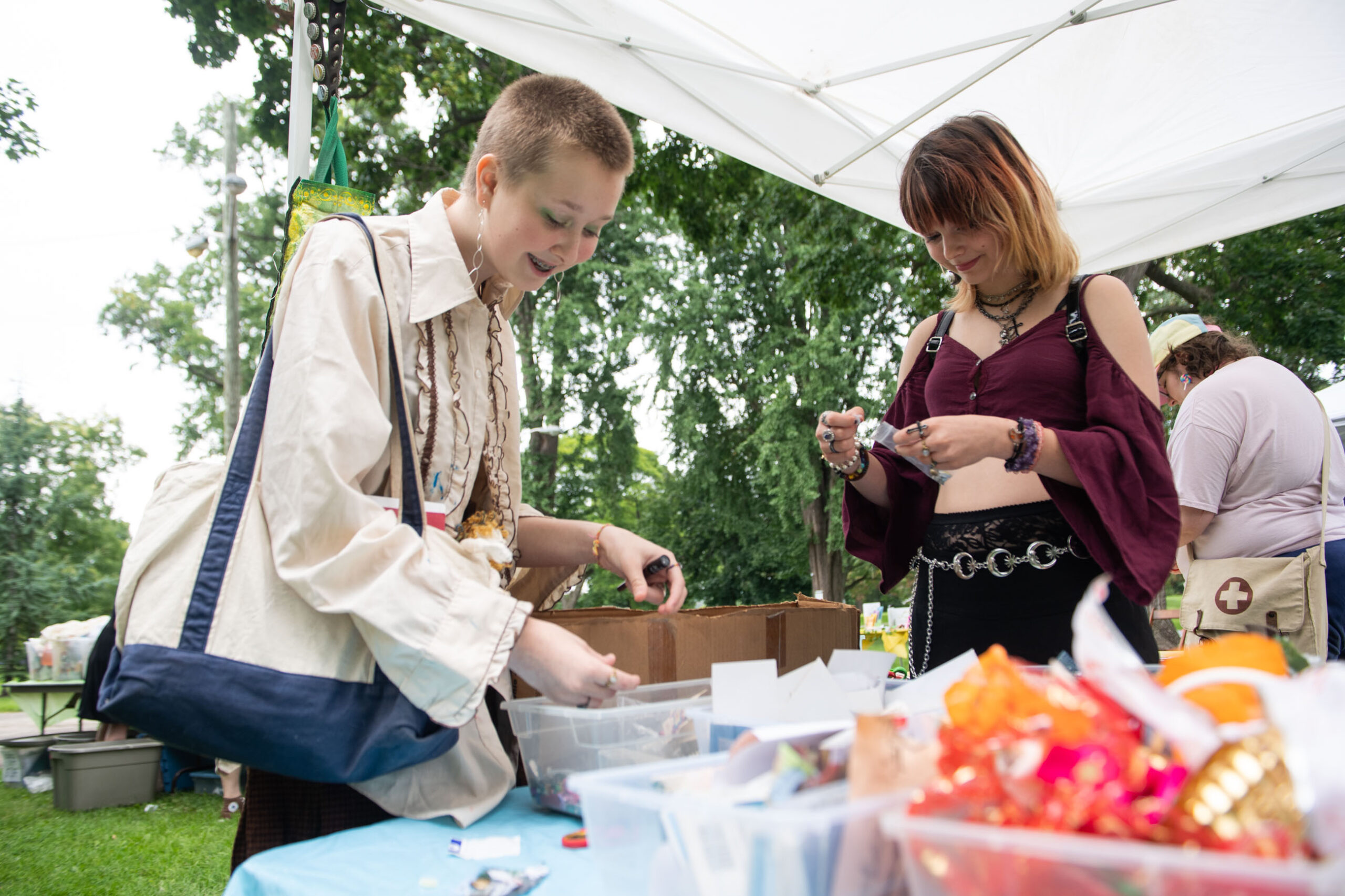 River Mull, let, of Point Breeze, and Rue Chismar, of Oakland, pick out materials to use to make pins at Reuse Reunion, an art swap hosted by Pittsburgh Center for Creative Reuse, on Sunday, Aug. 14, 2022, at Westinghouse Park in Point Breeze. The art swap included hands-on activities and free materials that could be used to make art. Attendees could bring a piece of art to swap, but they could also take a piece without bringing anything. (Emily Matthews/Post-Gazette)