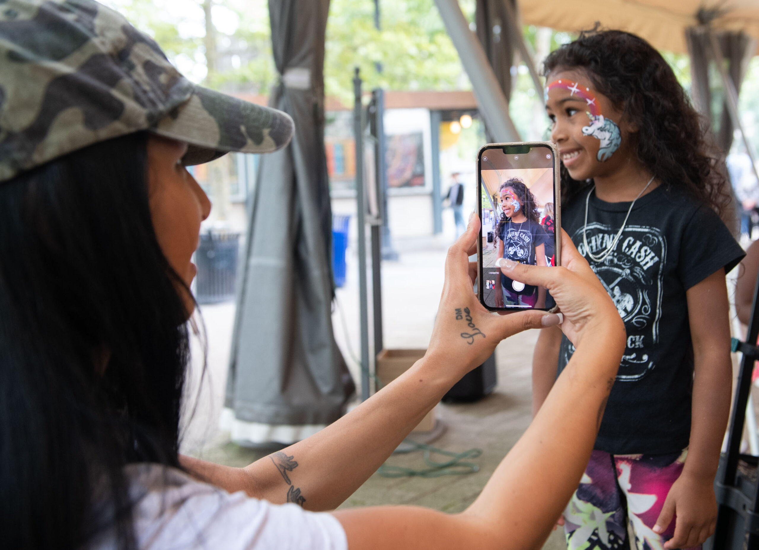 Larissa Malloy, left, of Blackridge, takes a photo her daughter Natalia Malloy, 6, after she got her face painted on Sunday, Aug. 14, 2022, during Kids’ Day in Schenley Plaza in Oakland. The event included free carousel rides, face painting, a balloon artist, and craft activities. (Emily Matthews/Post-Gazette)