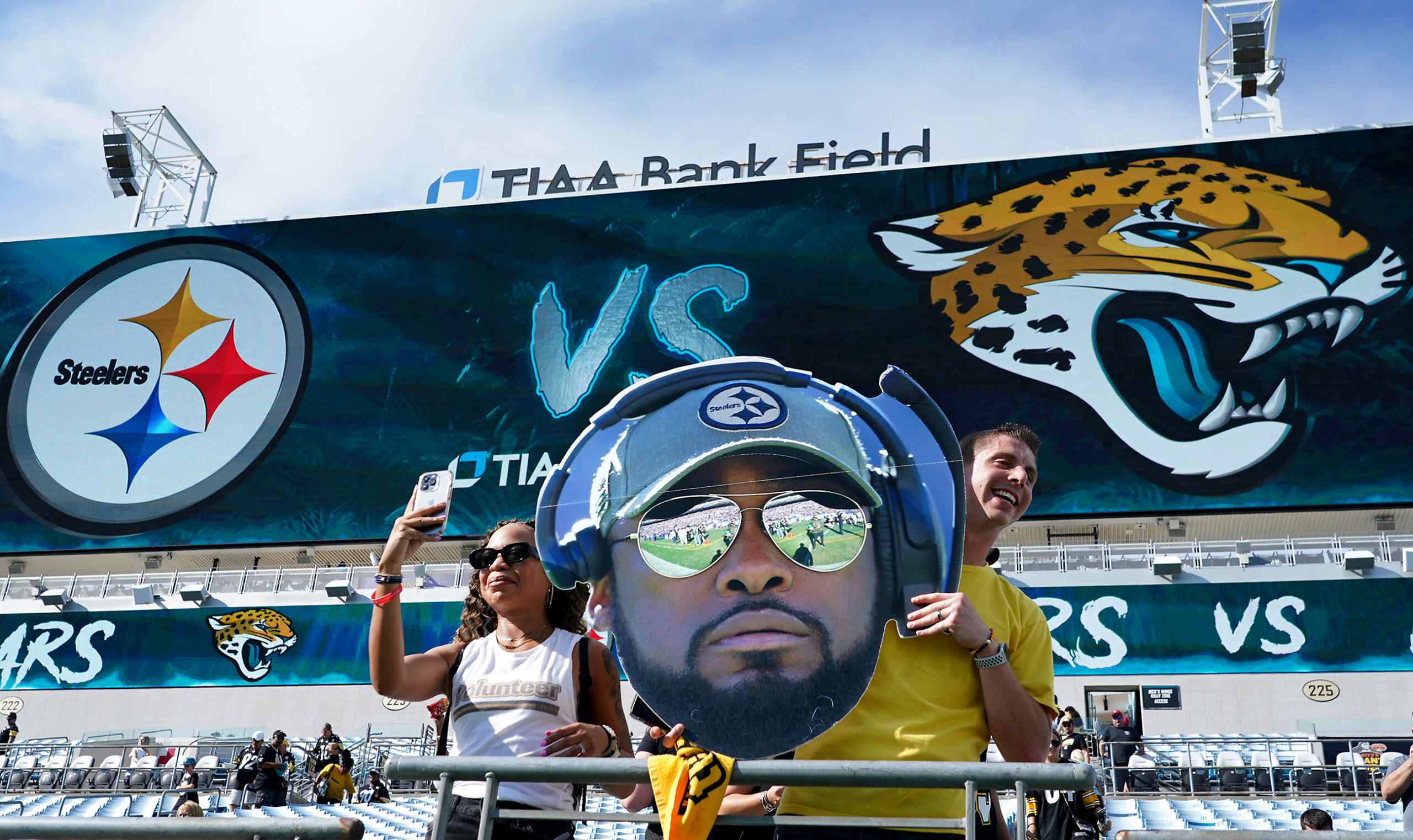 Steelers fans Jasmine Burt-Festa and her husband, Brandon Festa, watch as their team warms up to take on the Jaguars, Saturday, Aug. 20, 2022, at TIAA Bank Field in Jacksonville. We drove down this morning from Chattanooga, said Brandon. Its only six hours away and we wouldnt miss it. (Matt Freed/Post-Gazette)