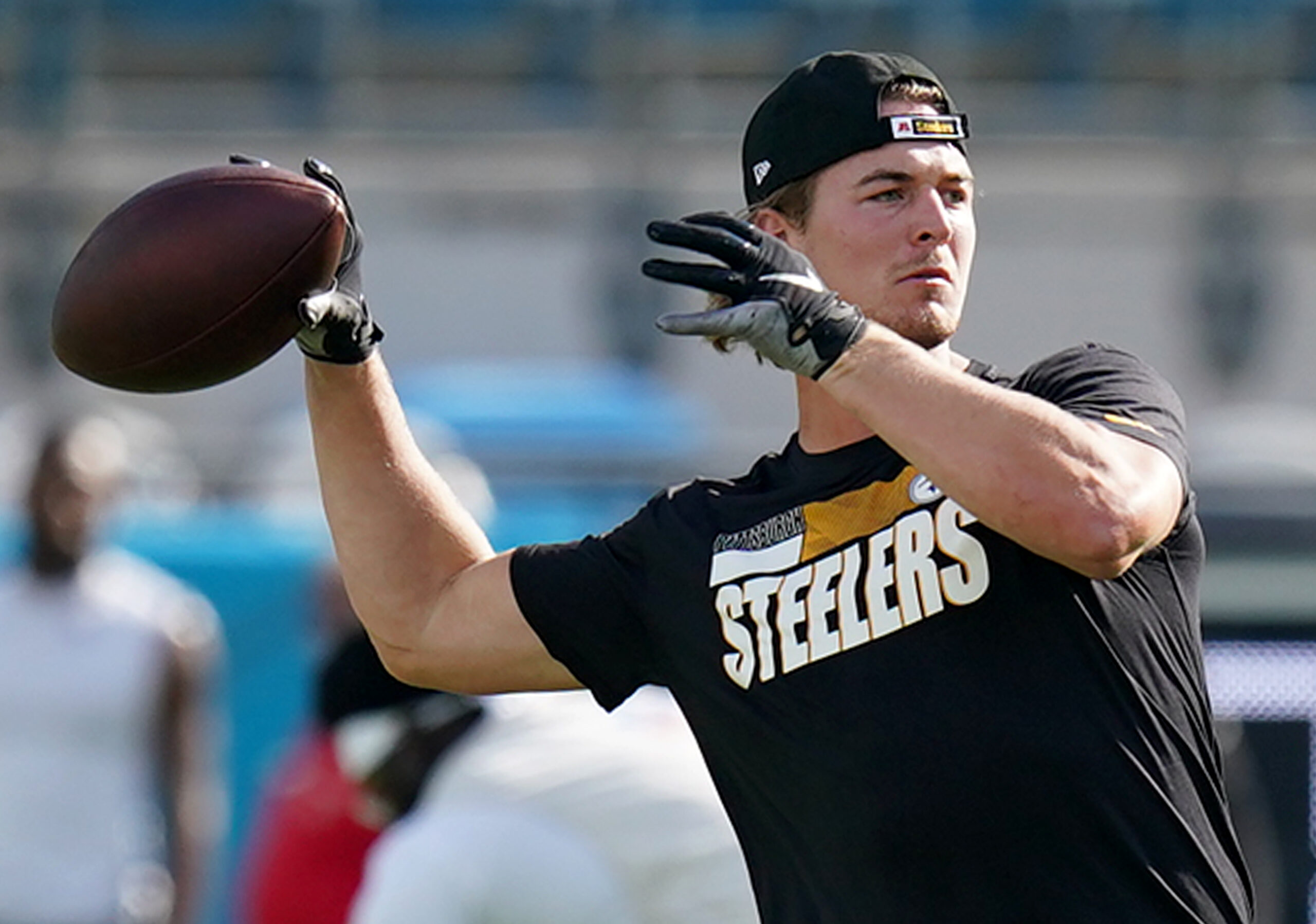 Steelers quarterback Kenny Pickett warms up before taking on the Jaguars, Saturday, Aug. 20, 2022, at TIAA Bank Field. (Matt Freed/Post-Gazette)