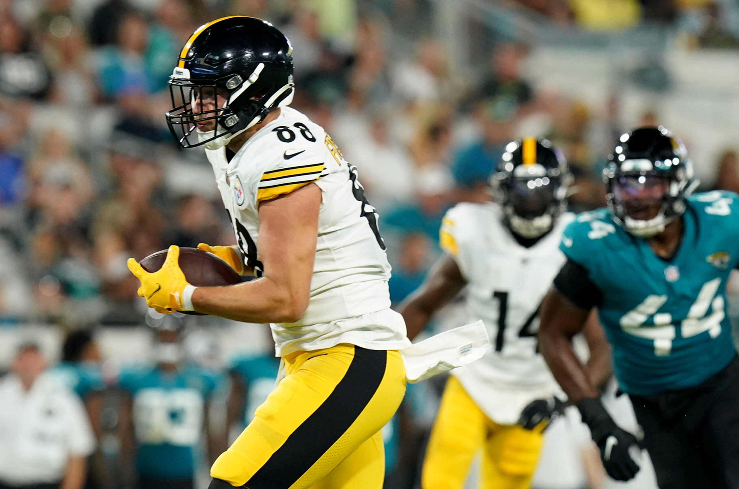 ss_Preseason Steelers Aug. 20, 2022 18 August 20, 2022 • 2560 × 1696 • Week in photos: Aug.14-20, 2022 Steelers tight end Pat Freiermuth pulls in a pass against the Jaguars in the second quarter, Saturday, Aug. 20, 2022, at TIAA Bank Field. (Matt Freed/Post-Gazette)