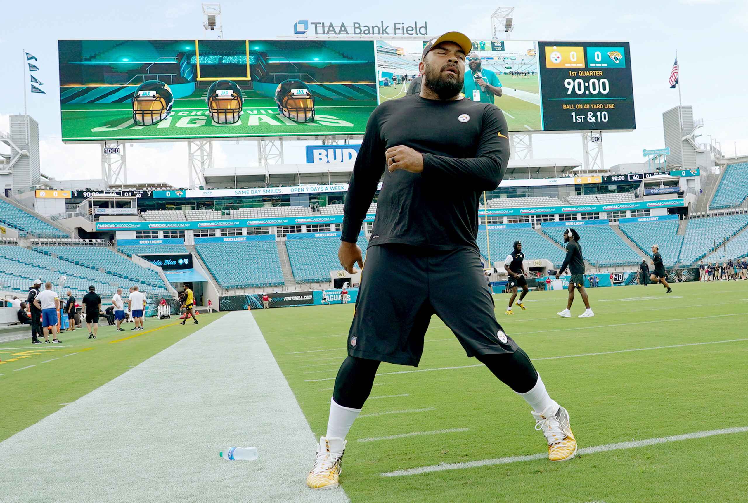Steelers defensive tackle Cameron Hayward warms up before taking on the Jaguars, Saturday, Aug. 20, 2022, at TIAA Bank Field. (Matt Freed/Post-Gazette)