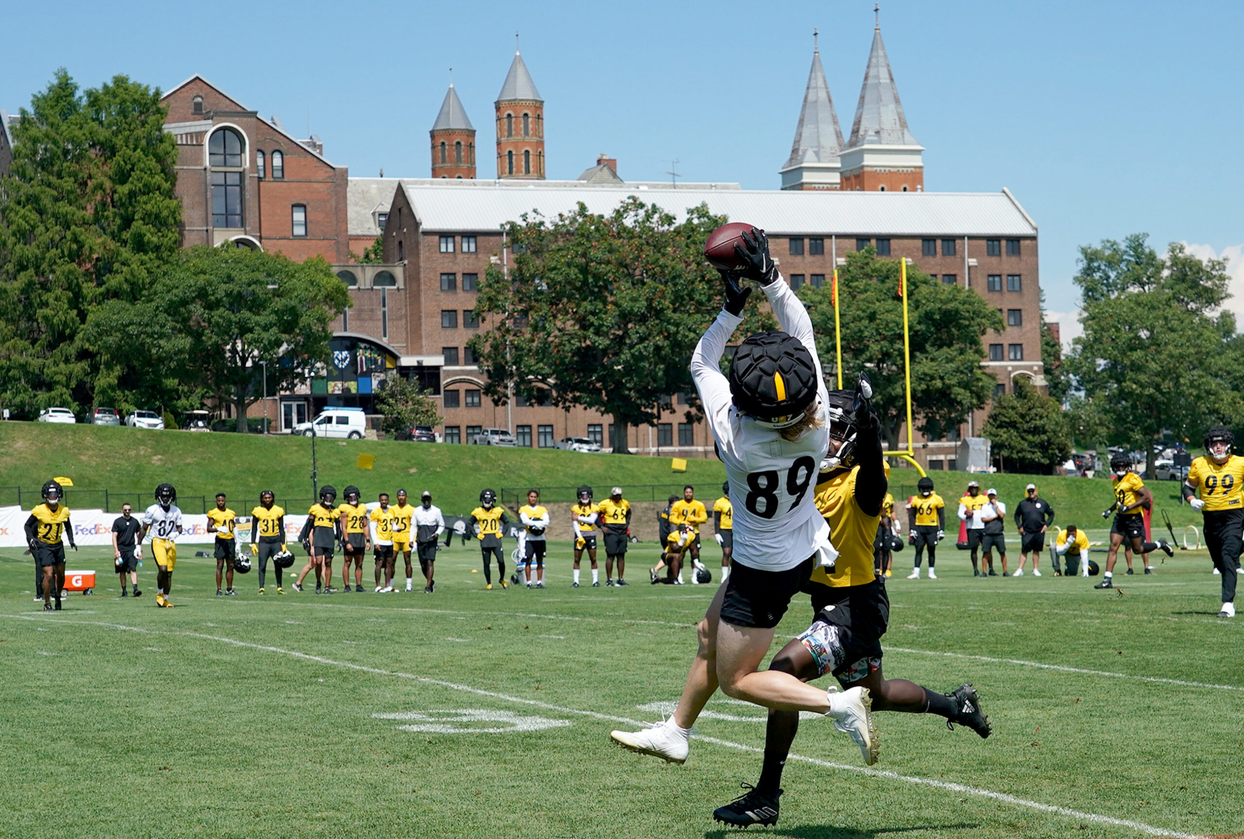 ss_Steelers camp Aug. 17, 2022 01 August 17, 2022 • 2560 × 1728 • Week in photos: Aug.14-20, 2022 Steelers wide receiver Gunner Olszewski pulls in a pass against safety Damontae Kazee during training camp, Wednesday, Aug. 17, 2022, at Saint Vincent College. (Matt Freed/Post-Gazette)