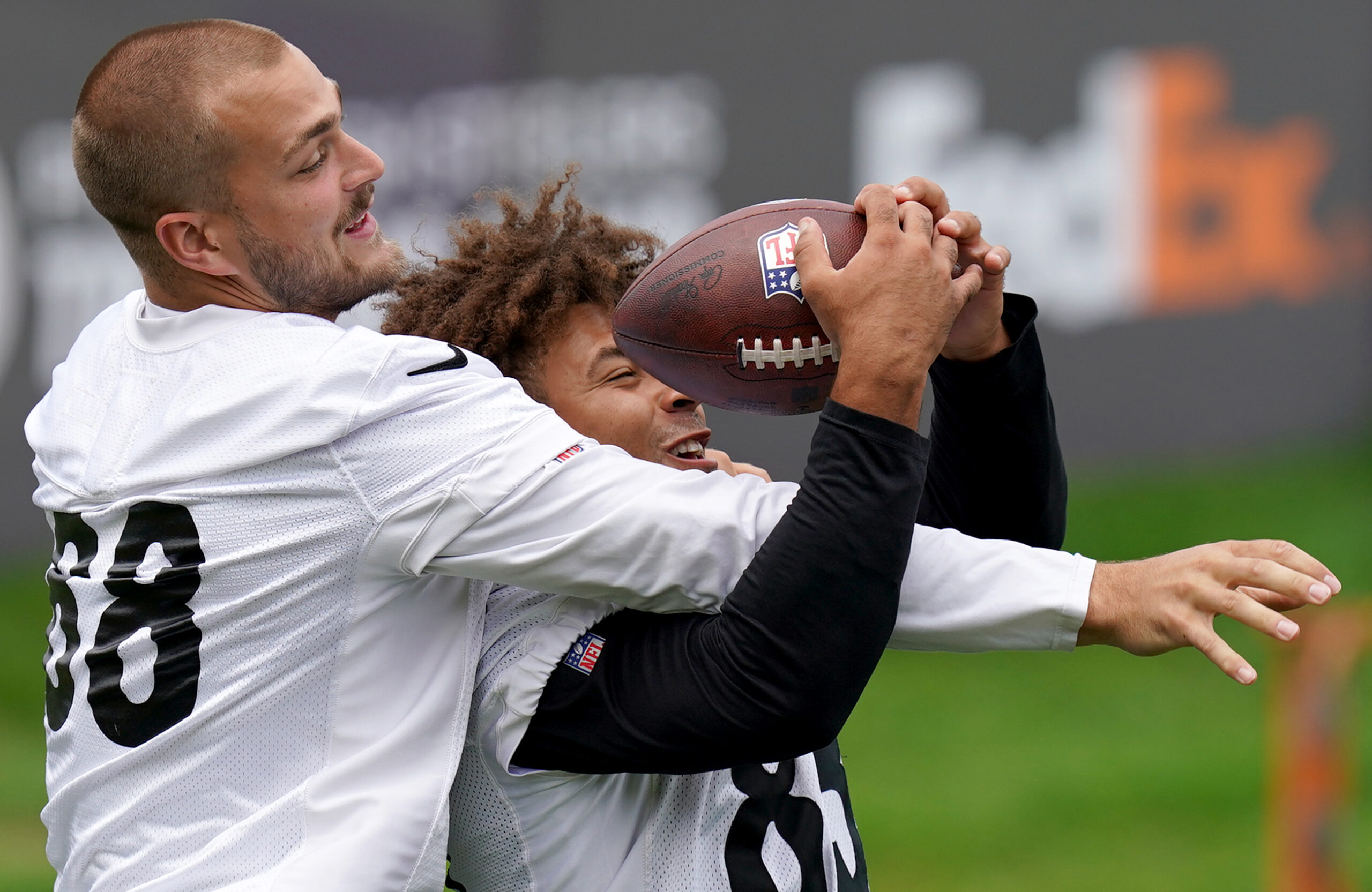 ss_Steelers camp Aug. 17, 2022 04 August 17, 2022 • 2560 × 1665 • Week in photos: Aug.14-20, 2022 Steelers tight ends Pat Freiermuth and Connor Heywood battle for a ball as they warm up training camp, Wednesday, Aug. 17, 2022, at Saint Vincent College. (Matt Freed/Post-Gazette)