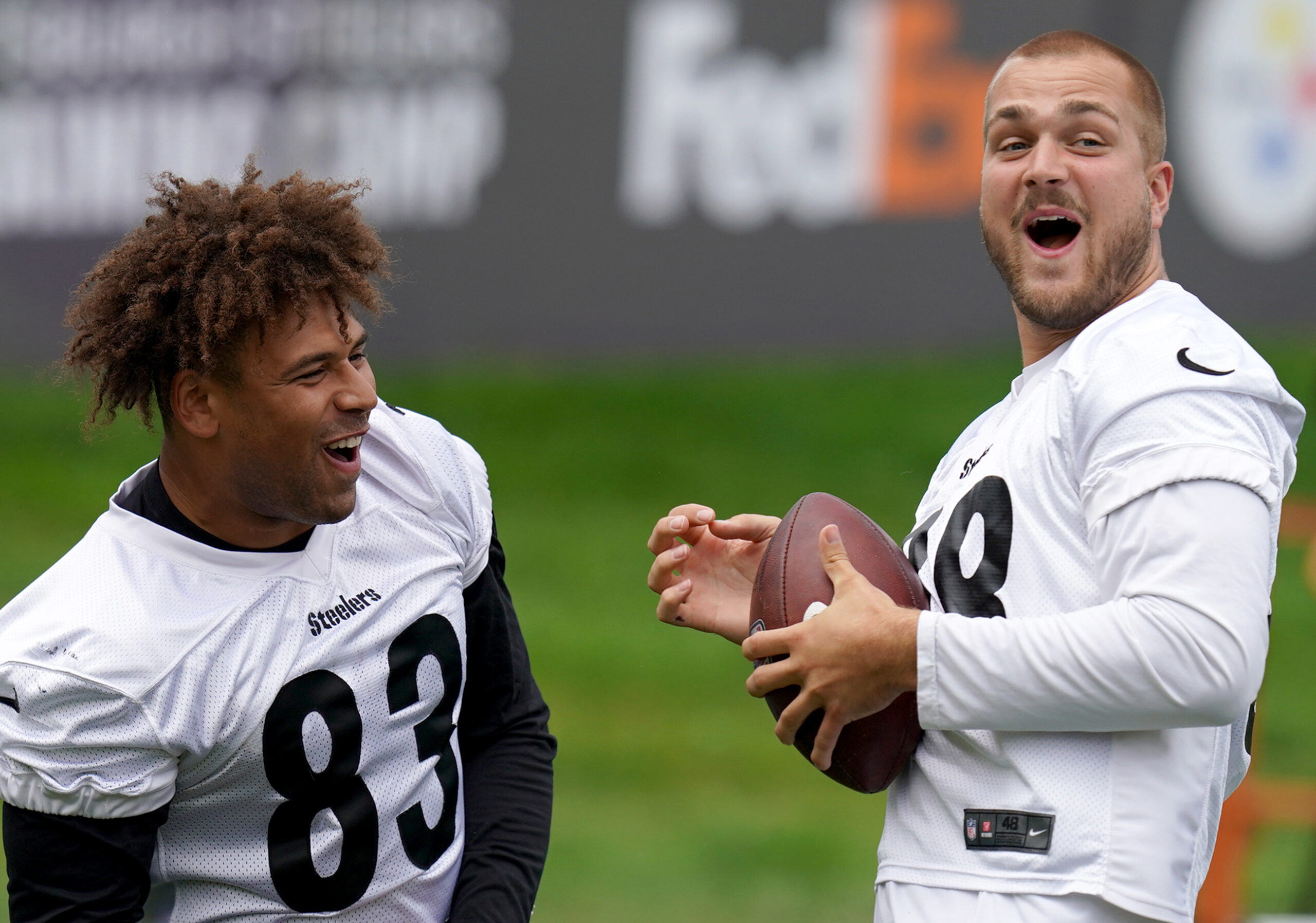 ss_Steelers camp Aug. 17, 2022 05 August 17, 2022 • 2560 × 1796 • Week in photos: Aug.14-20, 2022 Steelers tight end Pat Freiermuth reacts after grabbing a pass from Connor Heywood as they warm up during training camp, Wednesday, Aug. 17, 2022, at Saint Vincent College. (Matt Freed/Post-Gazette)