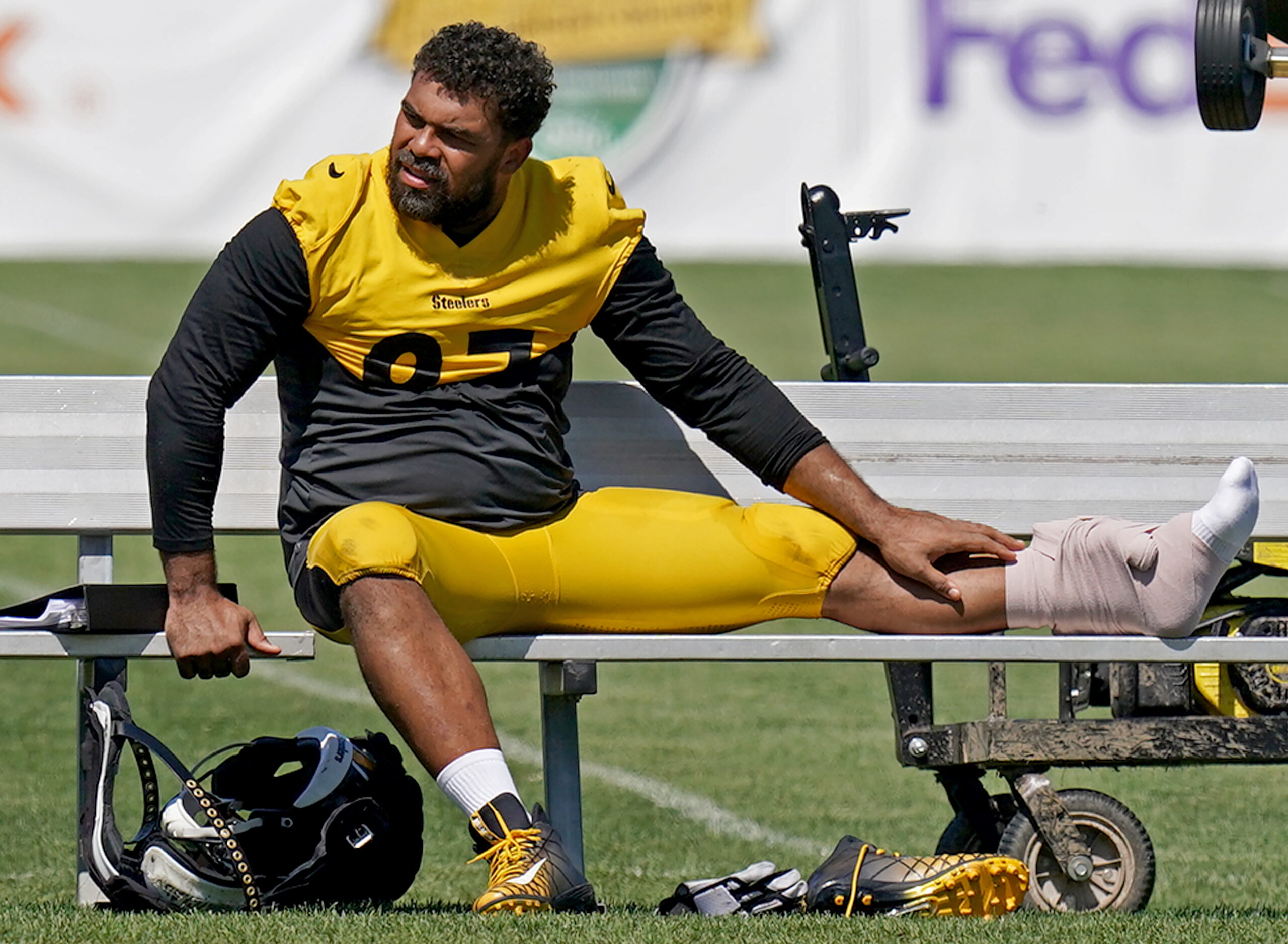 ss_Steelers camp Aug. 18, 2022 01 August 18, 2022 • 2560 × 1878 • Week in photos: Aug.14-20, 2022 Steelers defensive tackle Cameron Heyward sits on the bench after getting his ankle rollup up on during training camp, Thursday, Aug. 18, 2022, at Saint Vincent College. (Matt Freed/Post-Gazette)