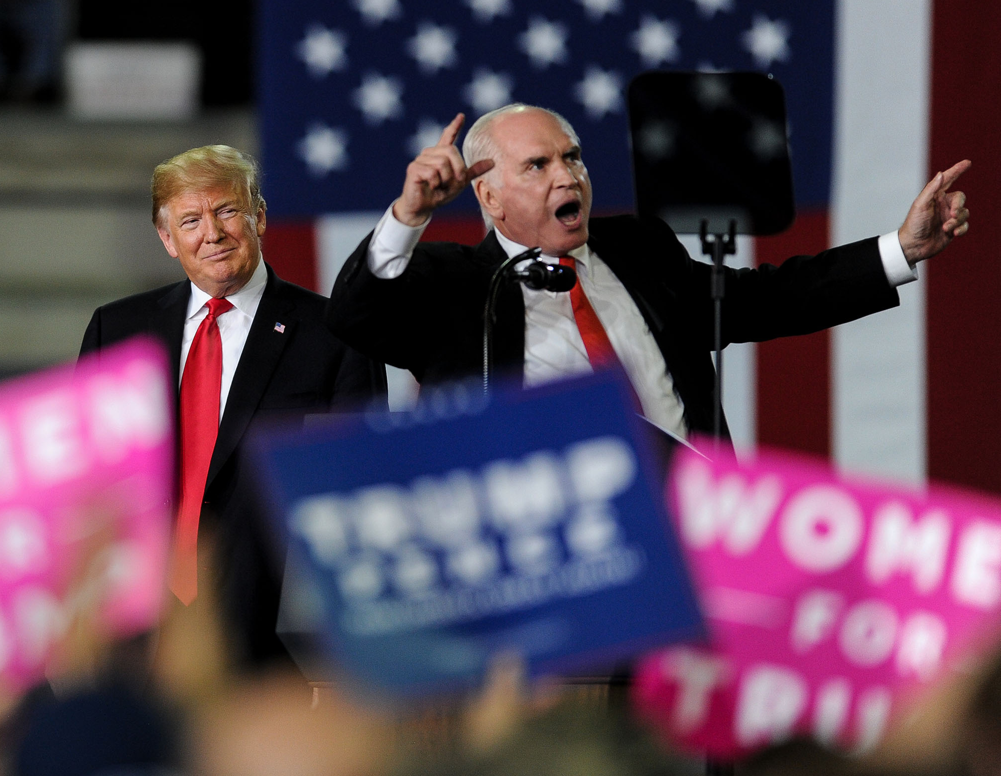 Rep. Mike Kelly, R-Pa., right, speaks as President Donald Trump looks on during a campaign rally in support of Kelly and U.S. Senate candidate Lou Barletta, Wednesday, Oct. 10, 2018, at the Erie Insurance Arena in Erie. (Alexandra Wimley/Post-Gazette)