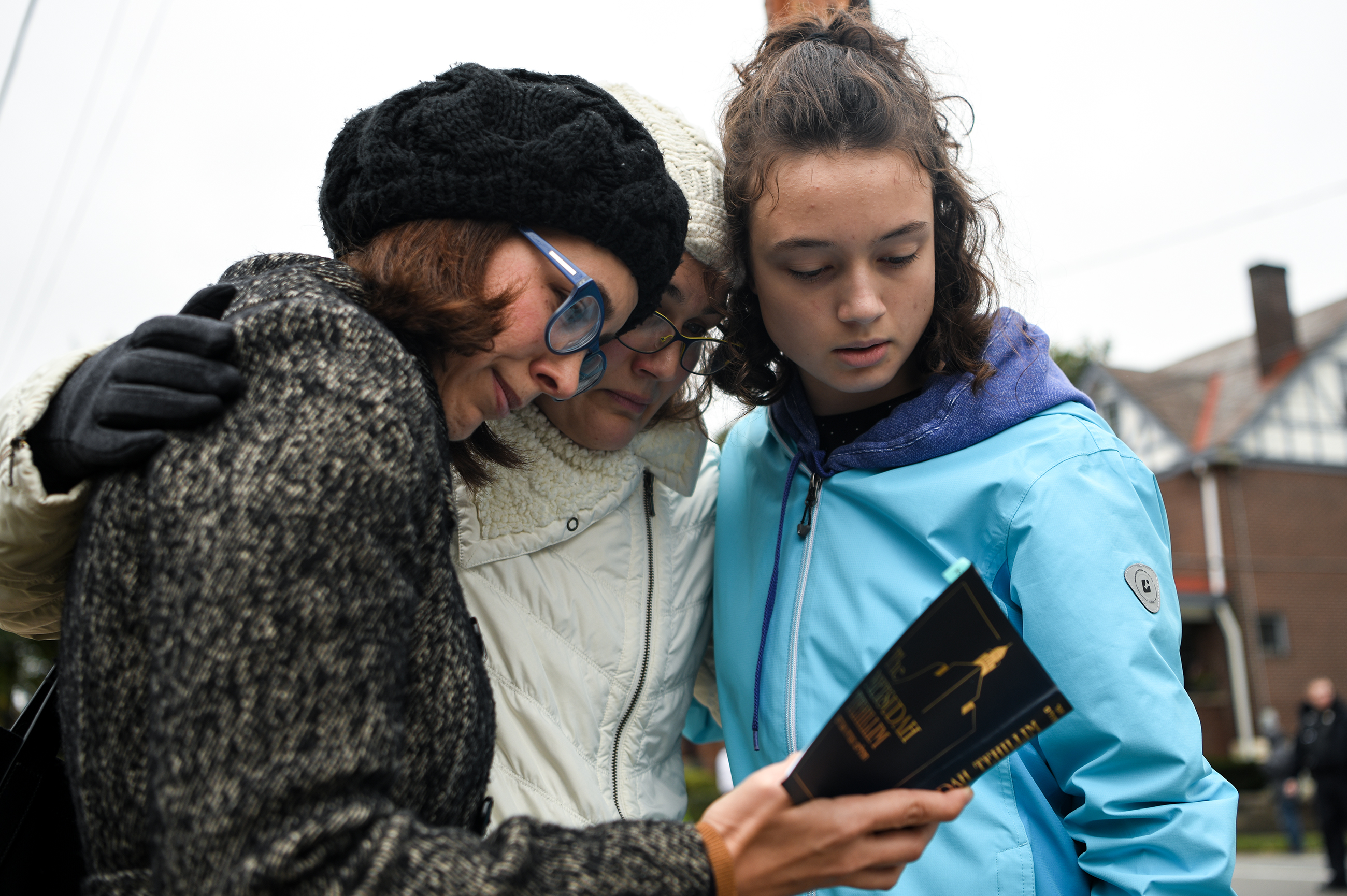 Tammy Helps, from left, Kate Rothstein, and her daughter Simone Rothstein, all of Squirrel Hill, read from a religious text and embrace on the intersection of Shady Avenue and Northumberland Street Police after multiple people were shot at The Tree of Life Congregation synagogue in Squirrel Hill, Oct, 27, 2018. (Alexandra Wimley/Post-Gazette)