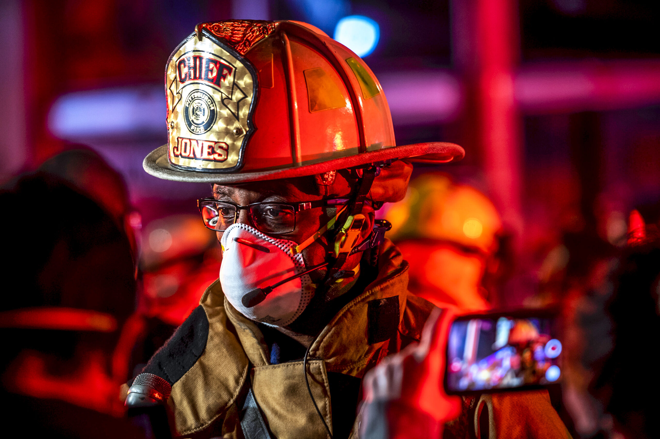 SS-fire_04 April 22, 2020 • 2560 × 1706 • SS-fire_04 City of Pittsburgh Fire Chief Darryl Jones speaks with members of the media. (Michael M. Santiago/Post-Gazette)