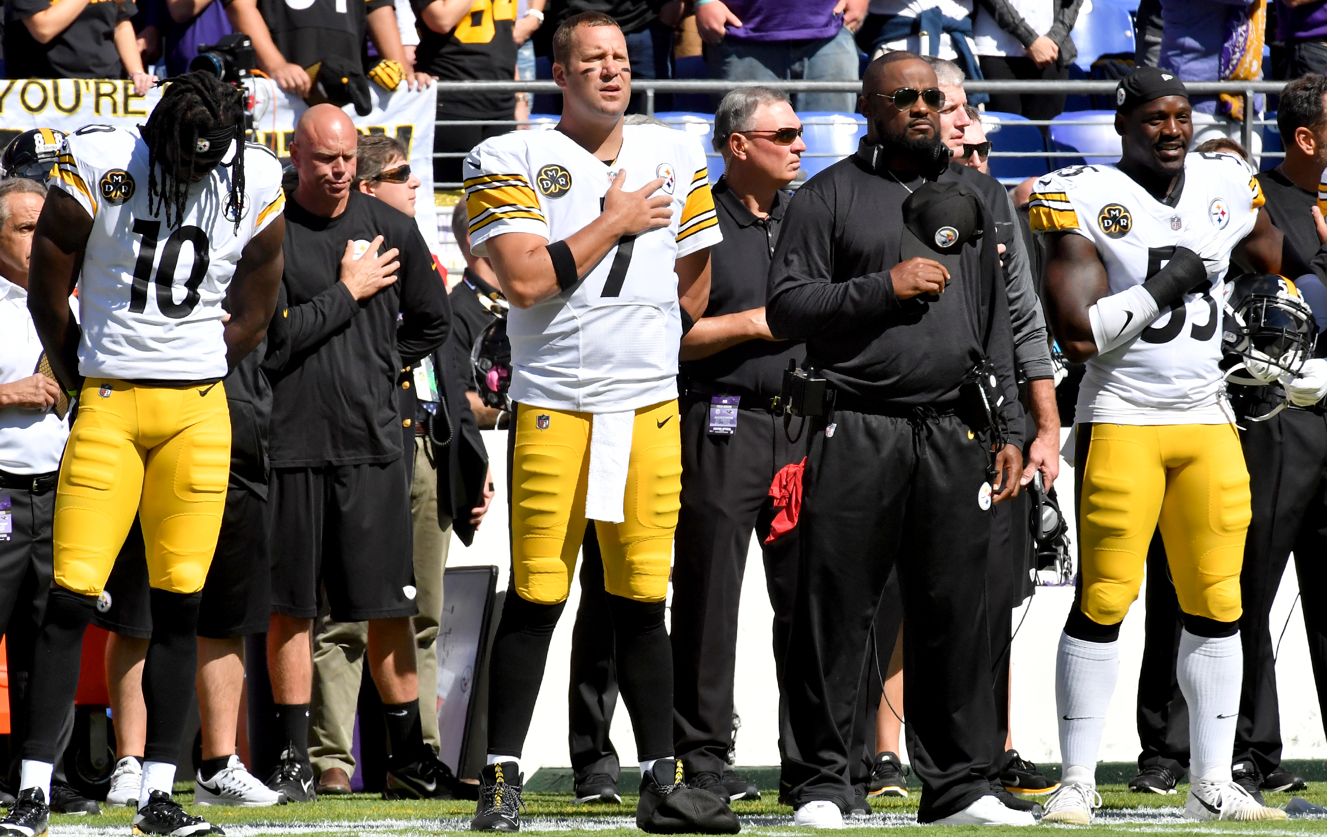 ss_20171001mfsteelersports15 October 1, 2017 • 2600 × 1641 • ss_20171001mfsteelersports15 Steelers quarterback Ben Roethlisberger stands next to Mike Tomlin for the national anthem before taking on the Ravens Sunday, October 1, 2017 at M&T Bank Stadium in Baltimore. (Matt Freed/Post-Gazette)