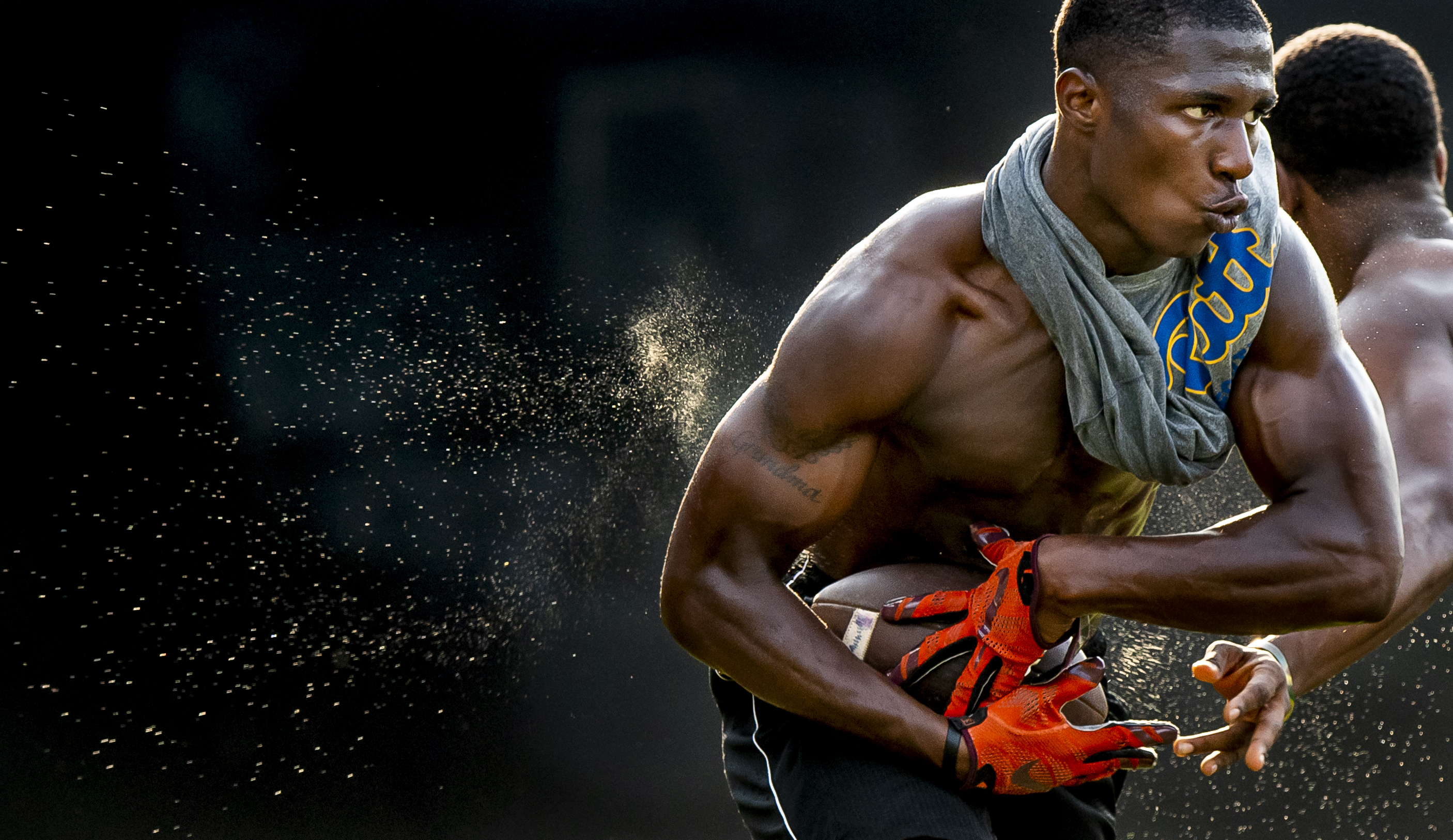 Sweat flies as USO’s Michael Snowden receives a hand off from quarterback Messiah Wilkerson during practice on Monday, July 29, 2019, at Obama Academy’s practice field. USO is University Prep, Sci-Tech and Obama Academy. (Steph Chambers/Post-Gazette)
