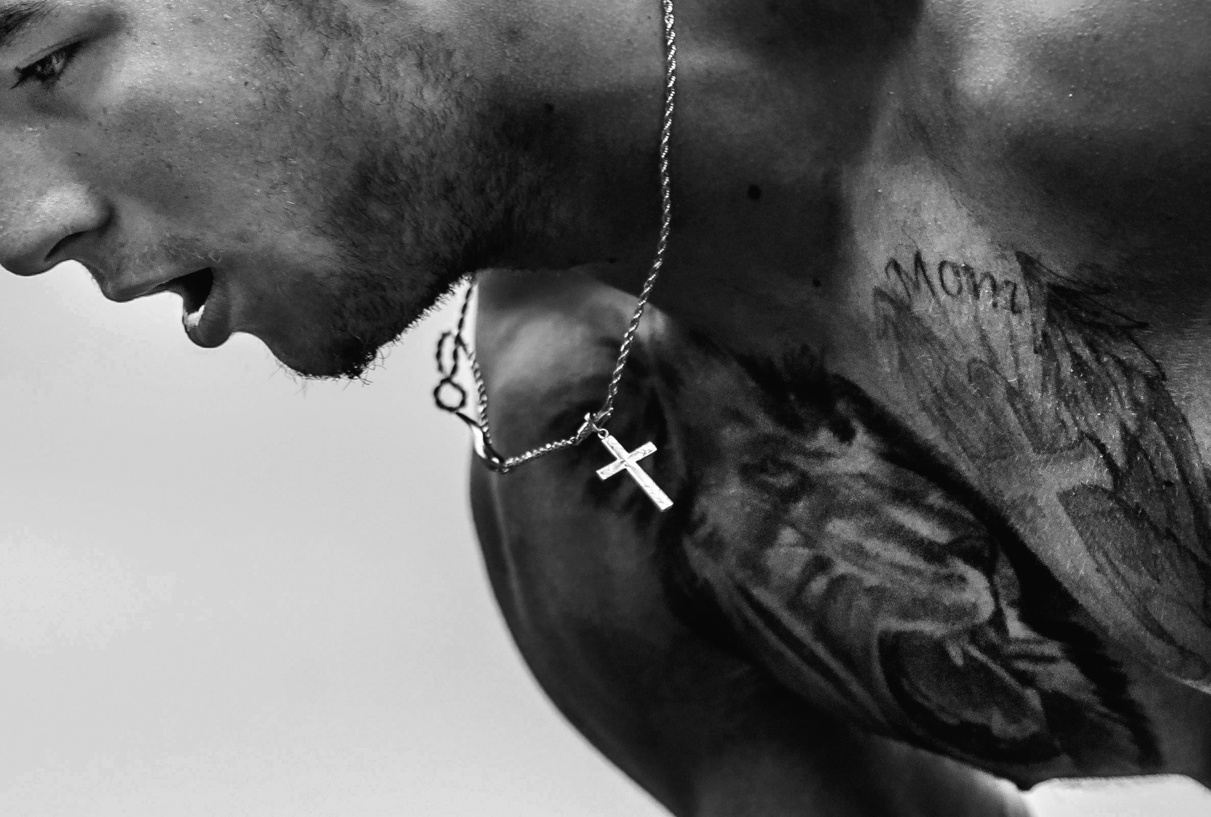 SSFootballTab2019_WideEdit_08 August 16, 2019 • 2372 × 1600 • SSFootballTab2019_WideEdit_08 The cross necklace of Baldwin’s Angelo Priore swings against his tattooed chest as he runs through a cone drill during practice on Wednesday, July 17, 2019 at Baldwin High School. (Steph Chambers/Post-Gazette)