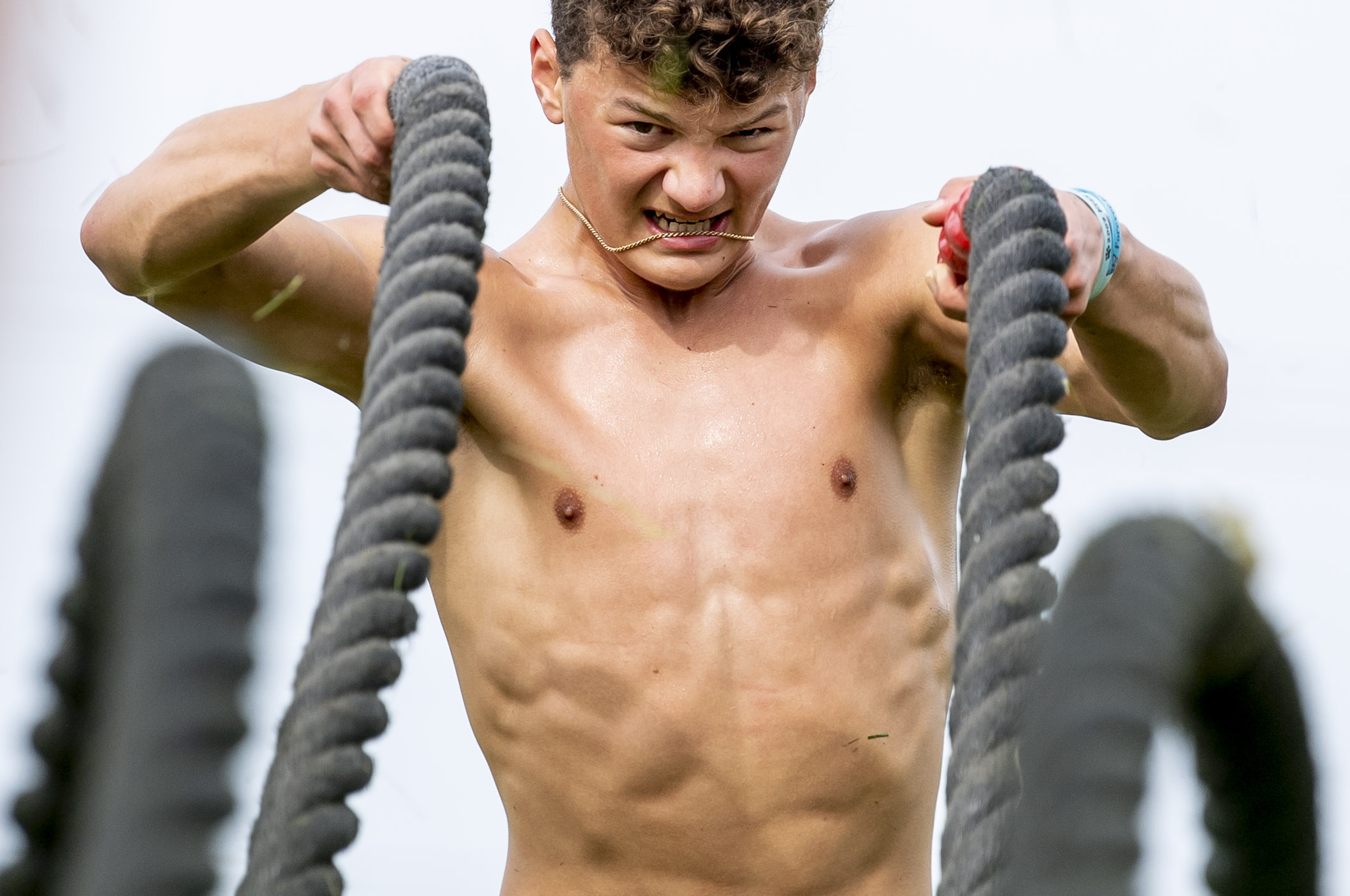 Freeport’s Garrett King works out with battle ropes during their circuit training on Friday, June 7, 2019, outside of Freeport Area High School. (Steph Chambers/Post-Gazette)