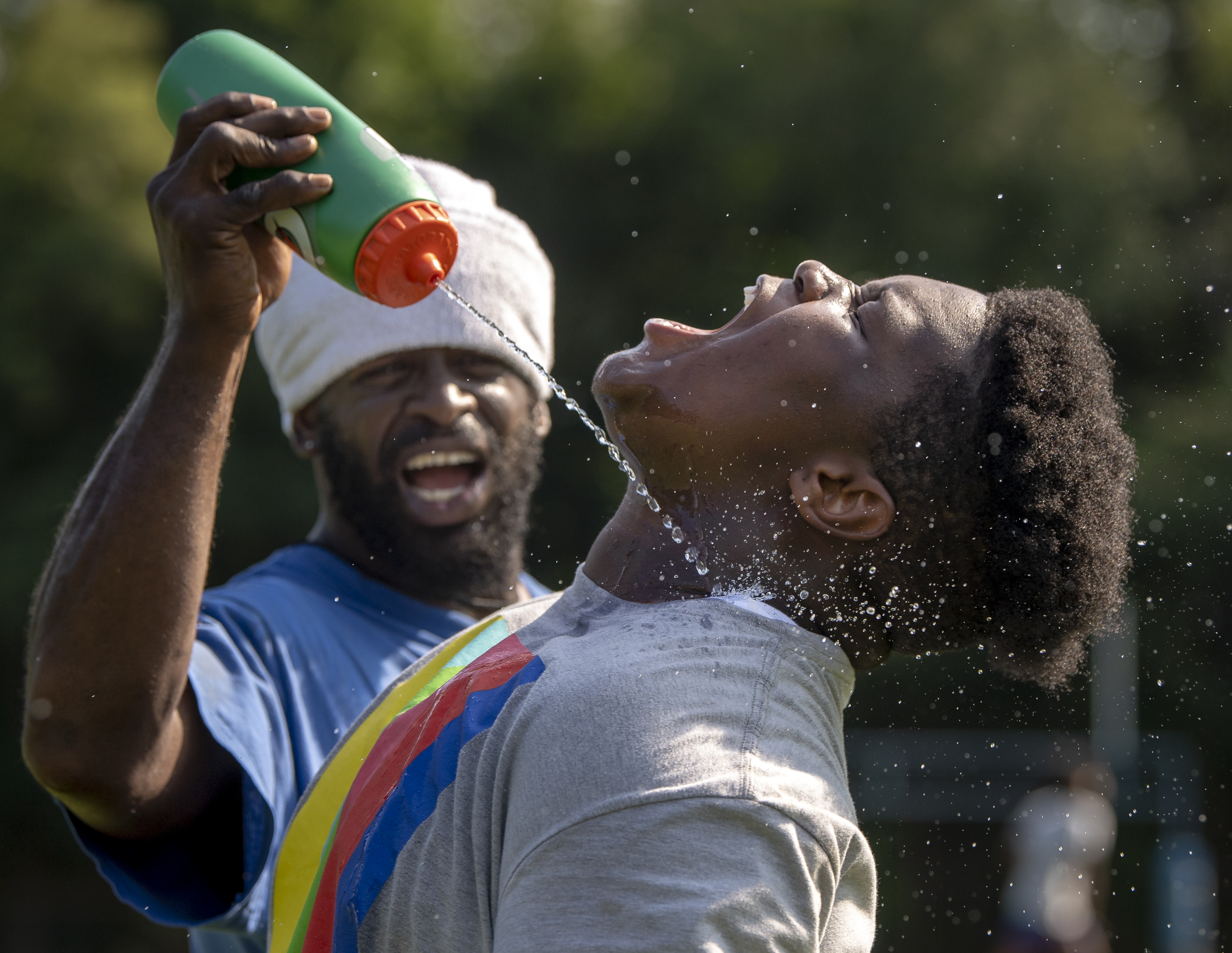 SSFootballTab2019_WideEdit_18 August 16, 2019 • 4012 × 3103 • SSFootballTab2019_WideEdit_18 Perry assistant coach Linwood Snyder squirts water onto Santana Kyser as he runs during practice on Thursday, July 25, 2019, at Perry Traditional Academy’s practice field behind Richard Way. (Steph Chambers/Post-Gazette)