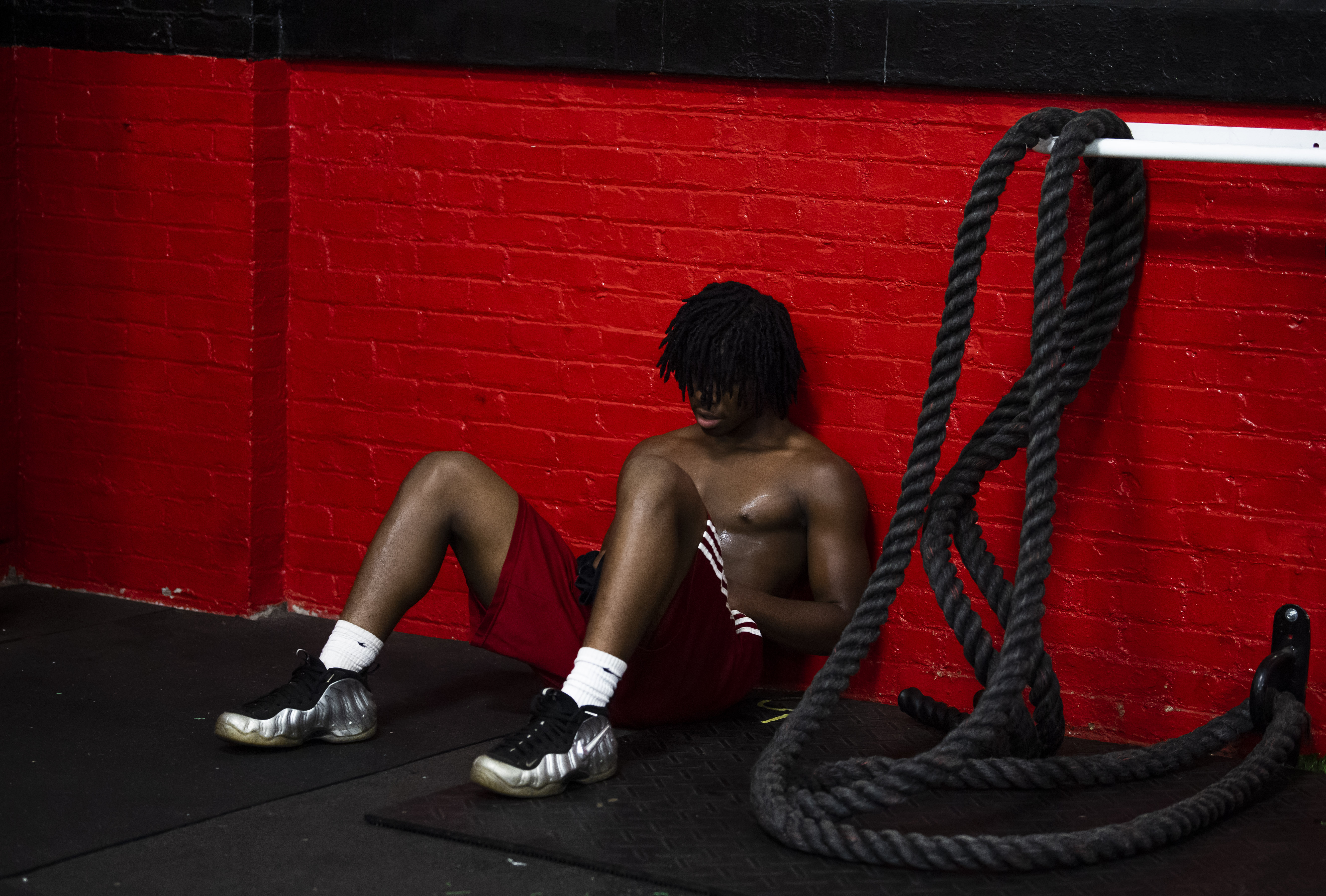 New Castle’s Malachi Sherman takes a break during a conditioning session on Monday, June 10, 2019, in “The Rack” at Taggart Stadium in New Castle. (Steph Chambers/Post-Gazette)