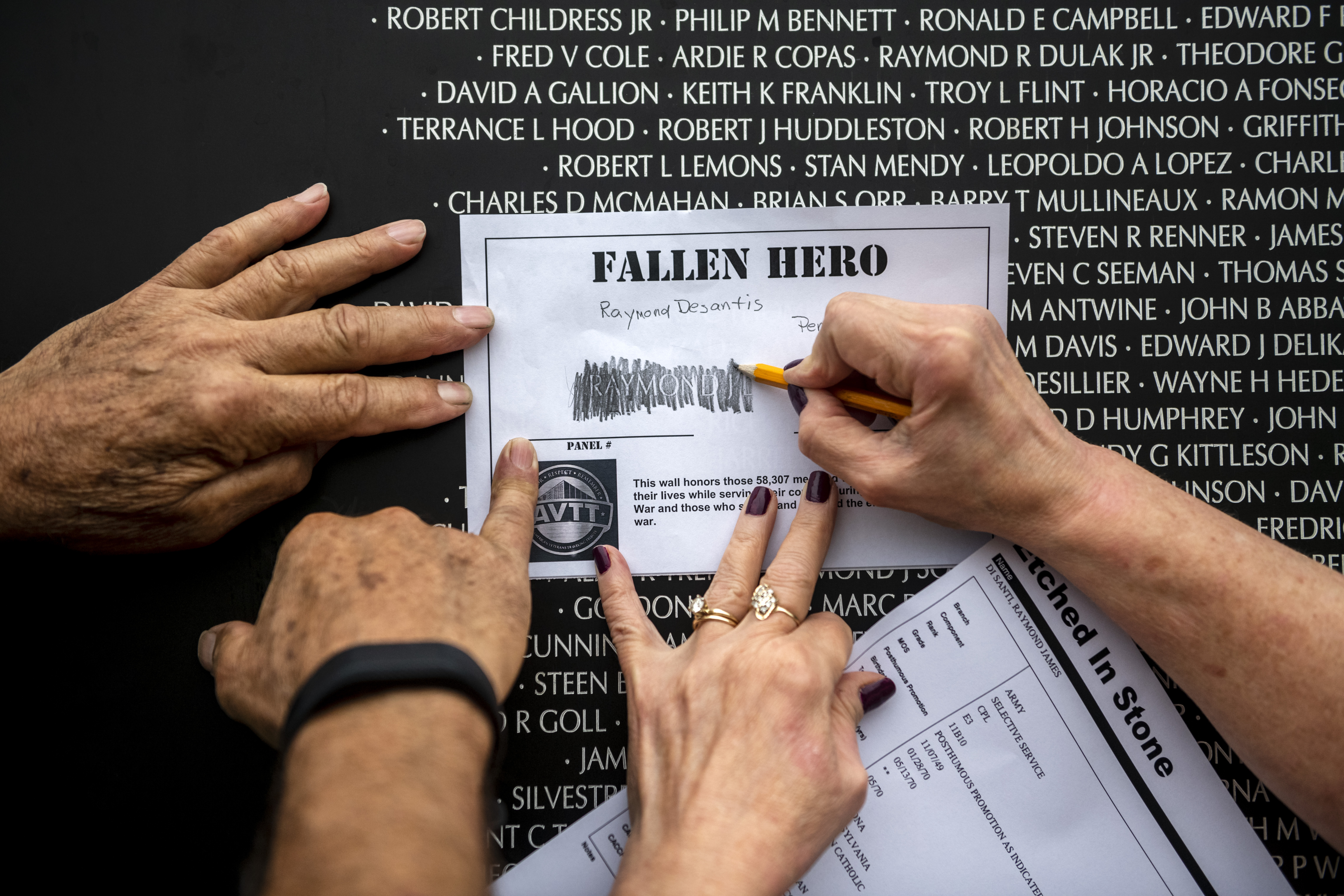 Jerry Deibel, left, and Jan Moynihan, both of Murrysville, etch the name of Raymond Di Santi, Moynihan’s classmate, during the opening ceremonies for the American Veterans Traveling Tribute Vietnam Wall, Wednesday, Oct. 10, 2018, at Murrysville Community Park in Murrysville. (Michael M. Santiago/Post-Gazette)