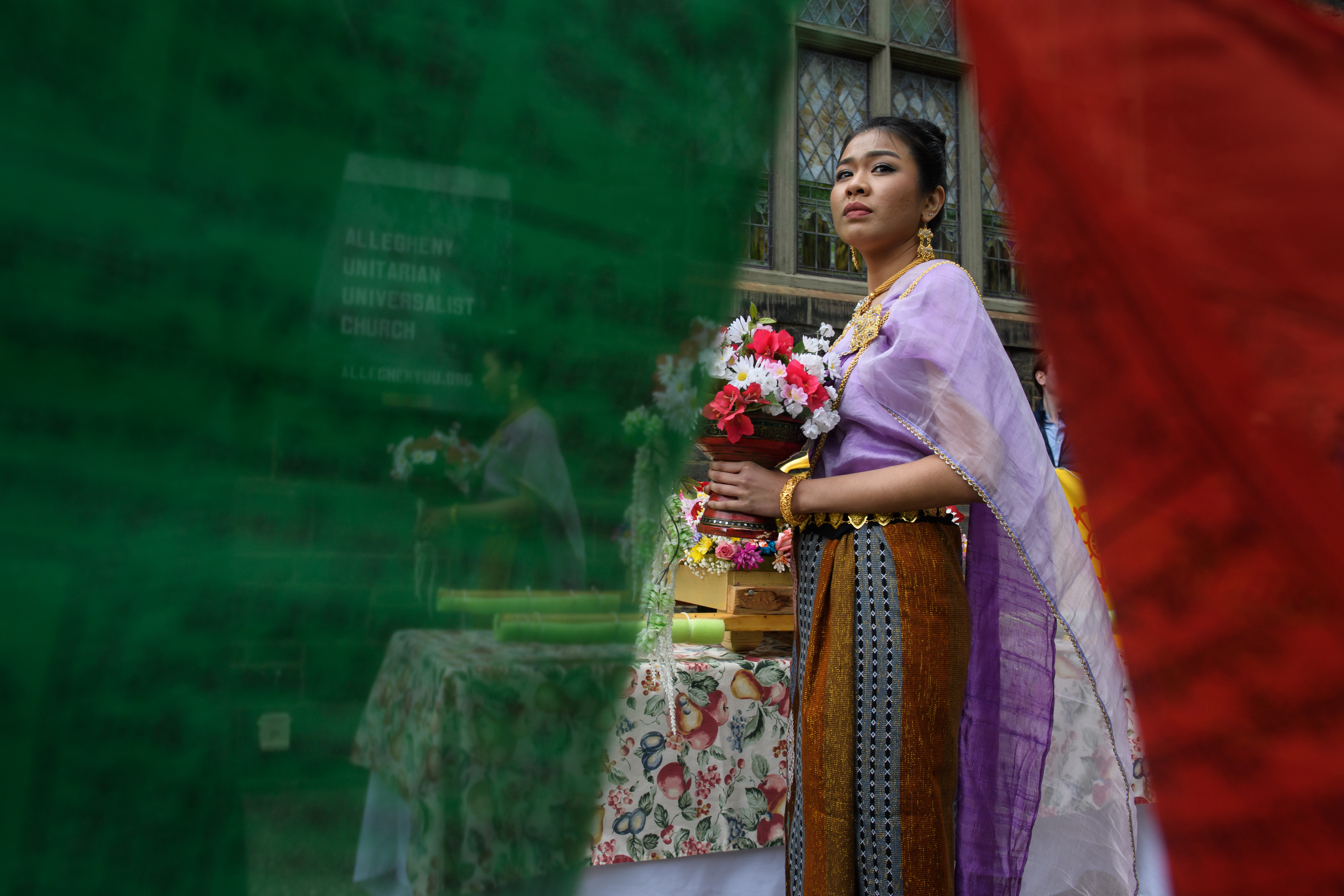 Breeze catches the edge of a strand of prayer flags as Thanawadee Kittkhot of Dormont waits to process for Vesak, the annual Buddhist festival marking the birth, enlightenment, and death of the Buddha, on Sunday, April 28, 2019, outside the Allegheny Unitarian Universalist Church in the Mexican War Streets. The holiday is marked with the bathing of a statue of Bhudda, formal offerings, and a procession to the river, where the blessed water is dropped into the tributary to join with the rest of the water flowing throughout the rest of the world. This year, the ceremony honored world peace, especially in the wake of shootings in synagogues in California and Pittsburgh, as well as in the churches in Sri Lanka. “When you hear shootings regularly on the news, we want people to realize we all have good in us,” said Bhante Pemaratana of the Pittsburgh Buddhist Center. (Stephanie Strasburg/Post-Gazette)