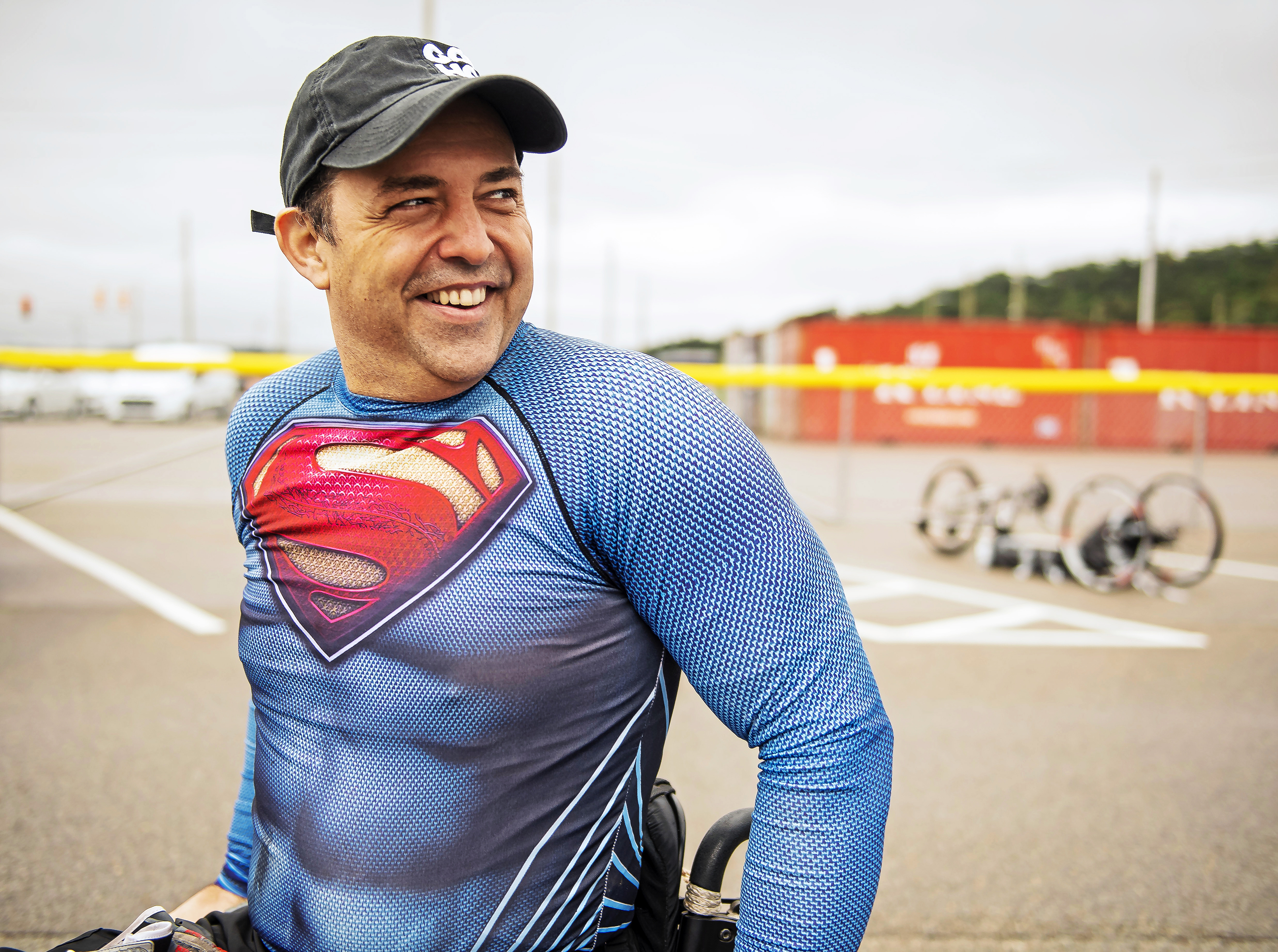 Handcyclist Attila Domos of Greenfield laughs as he greets friends before his attempt to break German hand-cyclist Thomas Lange’s 24-hour world record of 403.8 miles on Saturday, Oct. 12, 2019, at the Uber test track in Hazelwood. He was forced to stop around 3 a.m. about 16 hours into the challenge without breaking the record. (Steph Chambers/Post-Gazette)