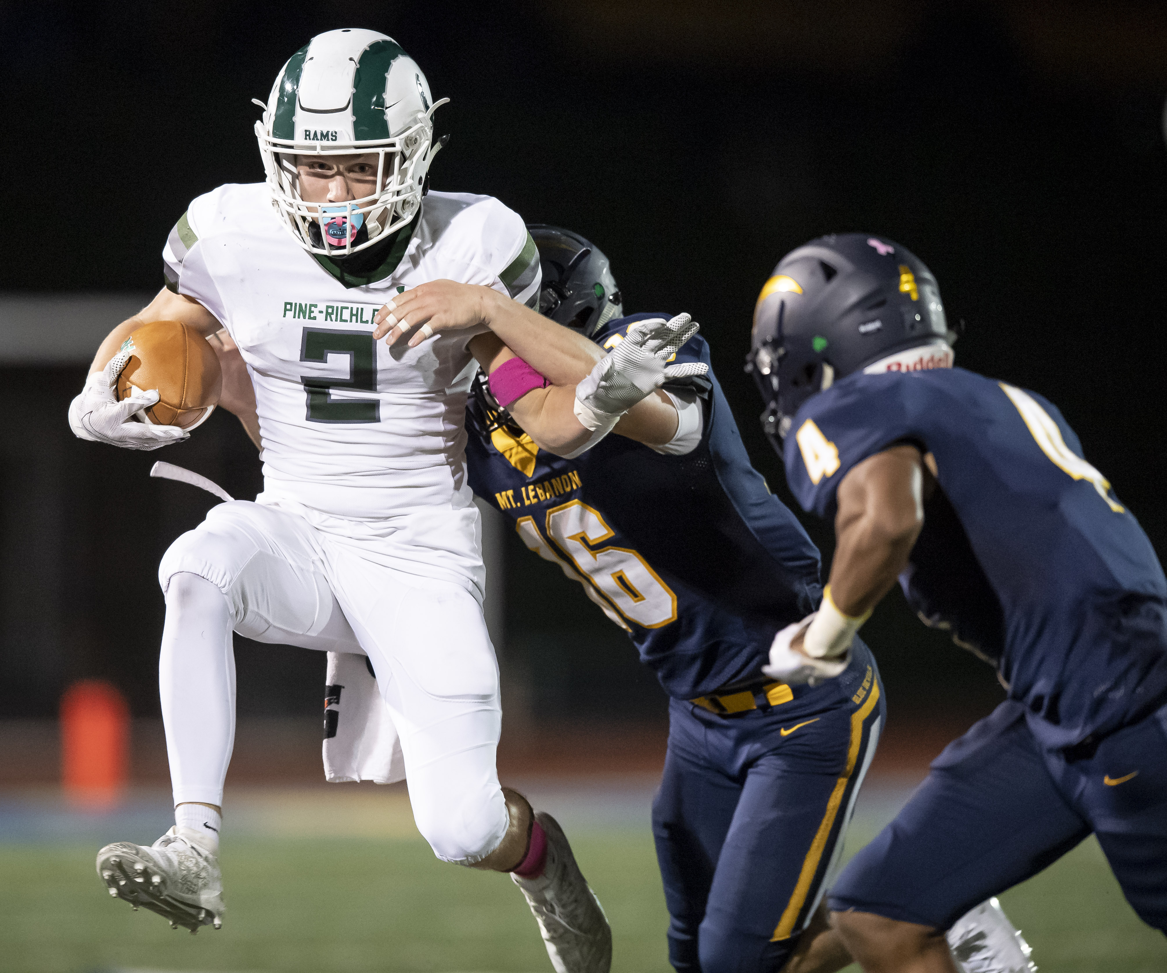 Pine-Richland’s Luke Meckler rushes against Mt. Lebanon’s Everett Lefever on Friday, Oct. 11, 2019, at Mt. Lebanon High School. Pine-Richland beat Mt. Lebanon, 41-0.(Steph Chambers/Post-Gazette)