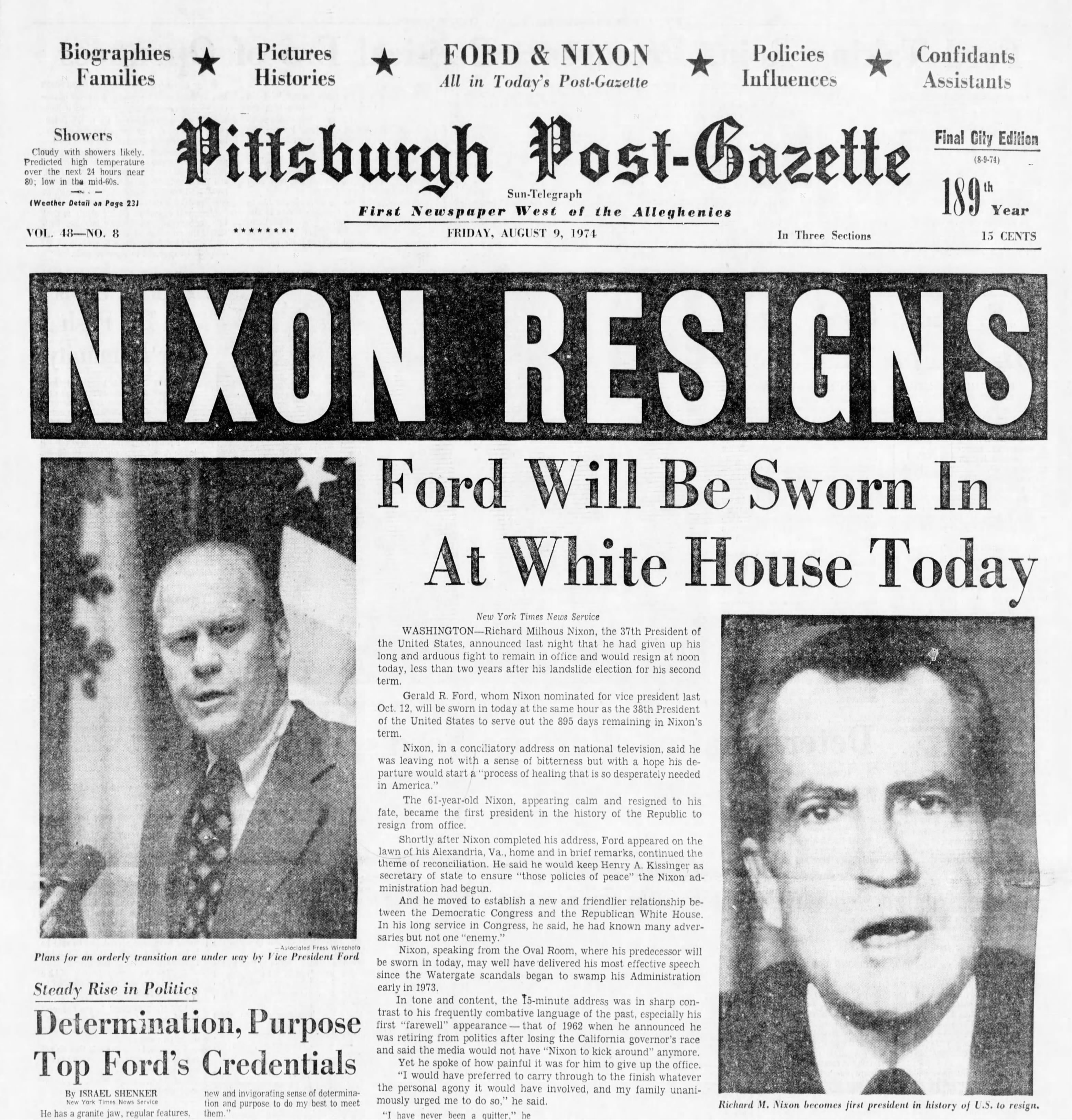 In 1972, the Watergate scandal broke, leading to revelations of illegal presidential wiretapping and spying, the presidential re-election campaign’s break-in at the opposing party’s headquarters in the Watergate Hotel, and a presidential coverup. Facing probable impeachment, Richard Nixon resigned in 1974, the only president ever to do so, leaving a trail of cynicism in his wake.