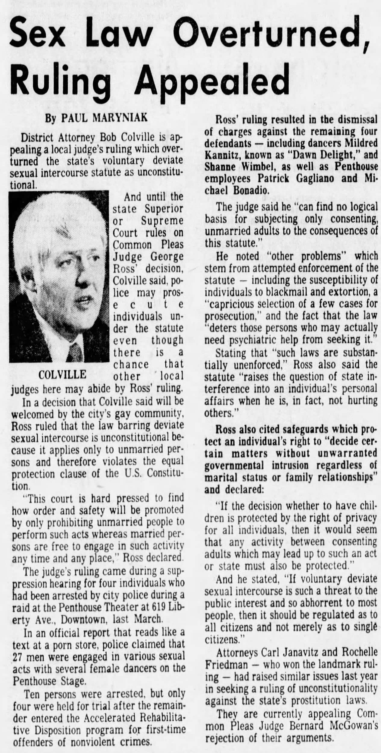 Gay sex — even anal and oral sex between consenting heterosexuals — was illegal in Pennsylvania and other states in 1965. Only in 1980 did the Pennsylvania Supreme Court find the state’s voluntary deviate sexual interactive law unconstitutional.