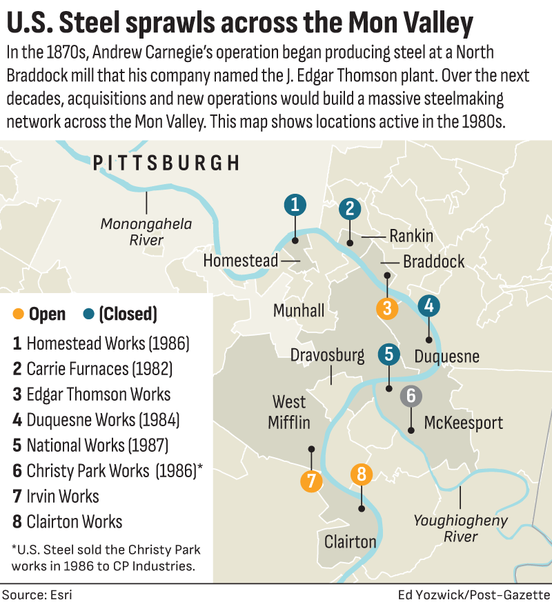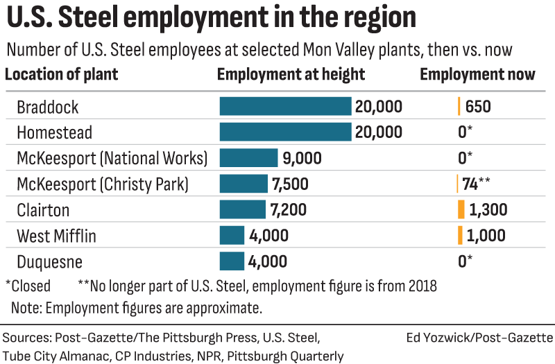 Today, the Mon Valley Works — Braddock, Clairton, West Mifflin — keep running, though with a much-reduced labor force that U.S. Steel estimates at about 3,000 people.