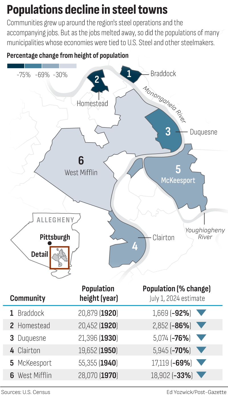 Homestead’s population hit a high of 20,452 in 1920, McKeesport in 1940 with 55,355 people, Duquesne in 1930 with 21,396, Braddock in 1920 with 20,879, West Mifflin in 1970 at 28,070 and Clairton in 1950 with 19,652.