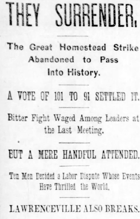 In November, the strike officially crumbled with a union vote of 101 in favor of returning to work, 91 against, according to the Pittsburgh Post. Returning workers had to accept Carnegie’s pay cuts and 12-hour days, and more than 300 — according to Rivers of Steel — were blacklisted from the steel business, never to be employed in it again.