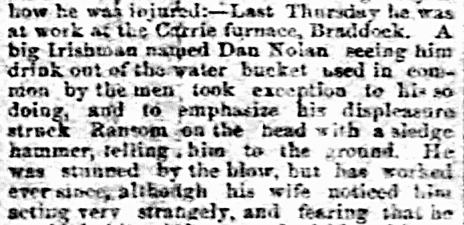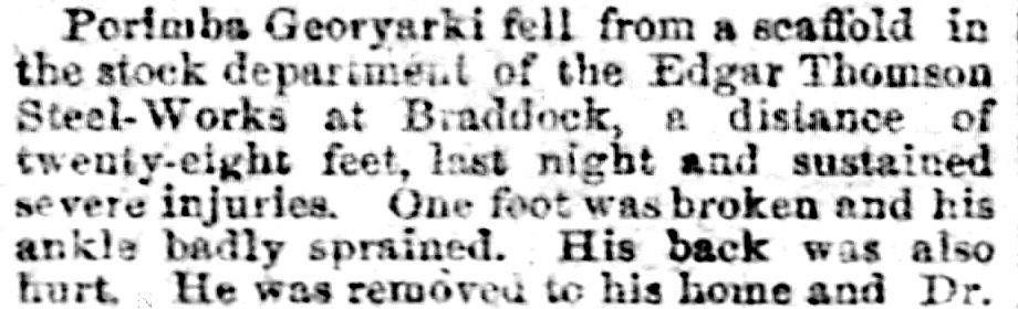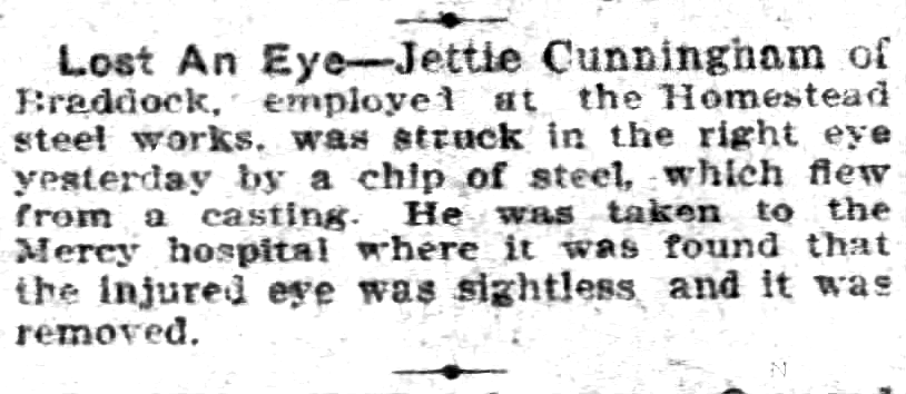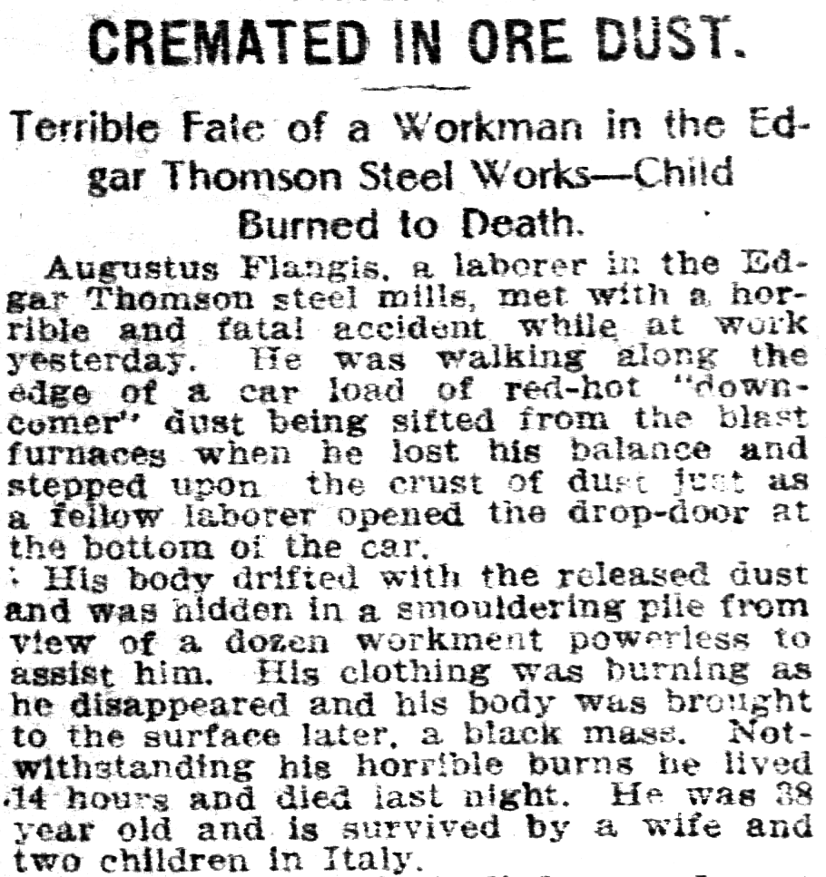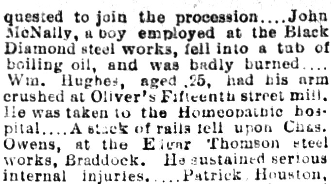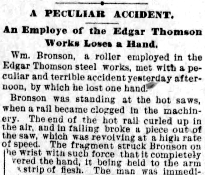 Being crushed by machinery, killed in explosions or burned by molten metal were among the potential hazards on the mill floor. Newspaper squibs of the late 1880s and early 1900s noted injuries from falling joists, men falling from high places and being run over by machinery. In one case, a man hit another in the head with a sledgehammer. On purpose.