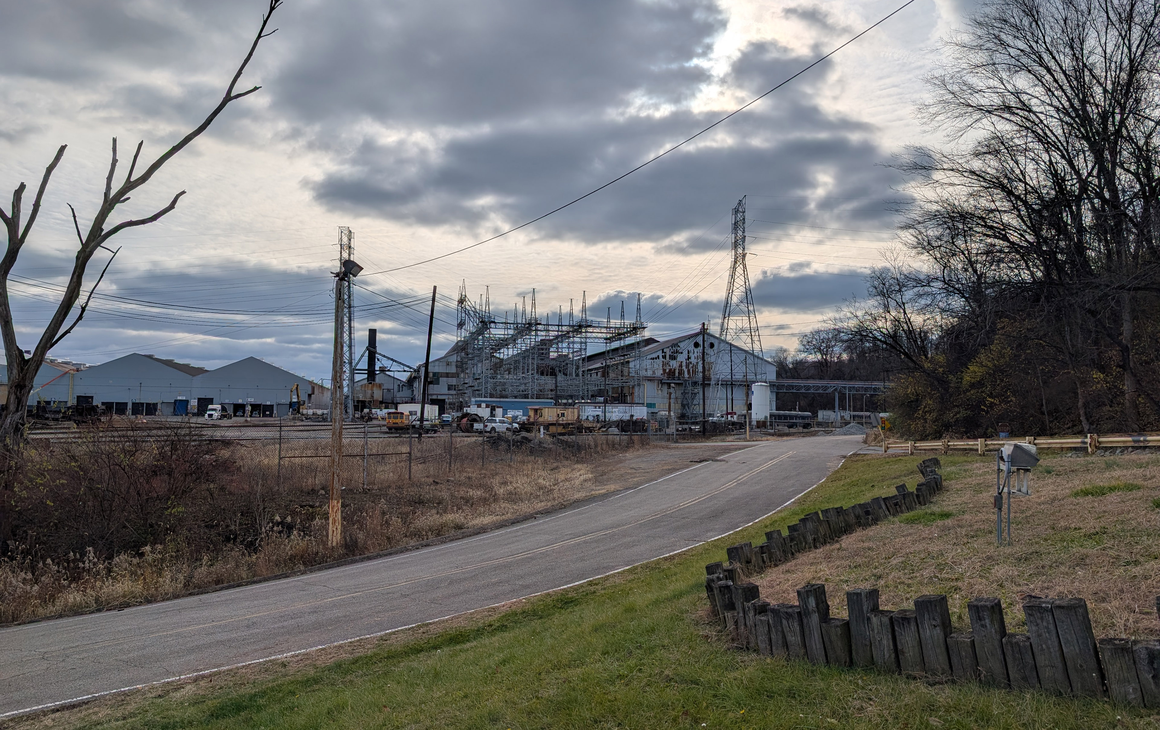 The plant’s windowless blue and gray walls rise over Braddock Avenue’s low-slung buildings.